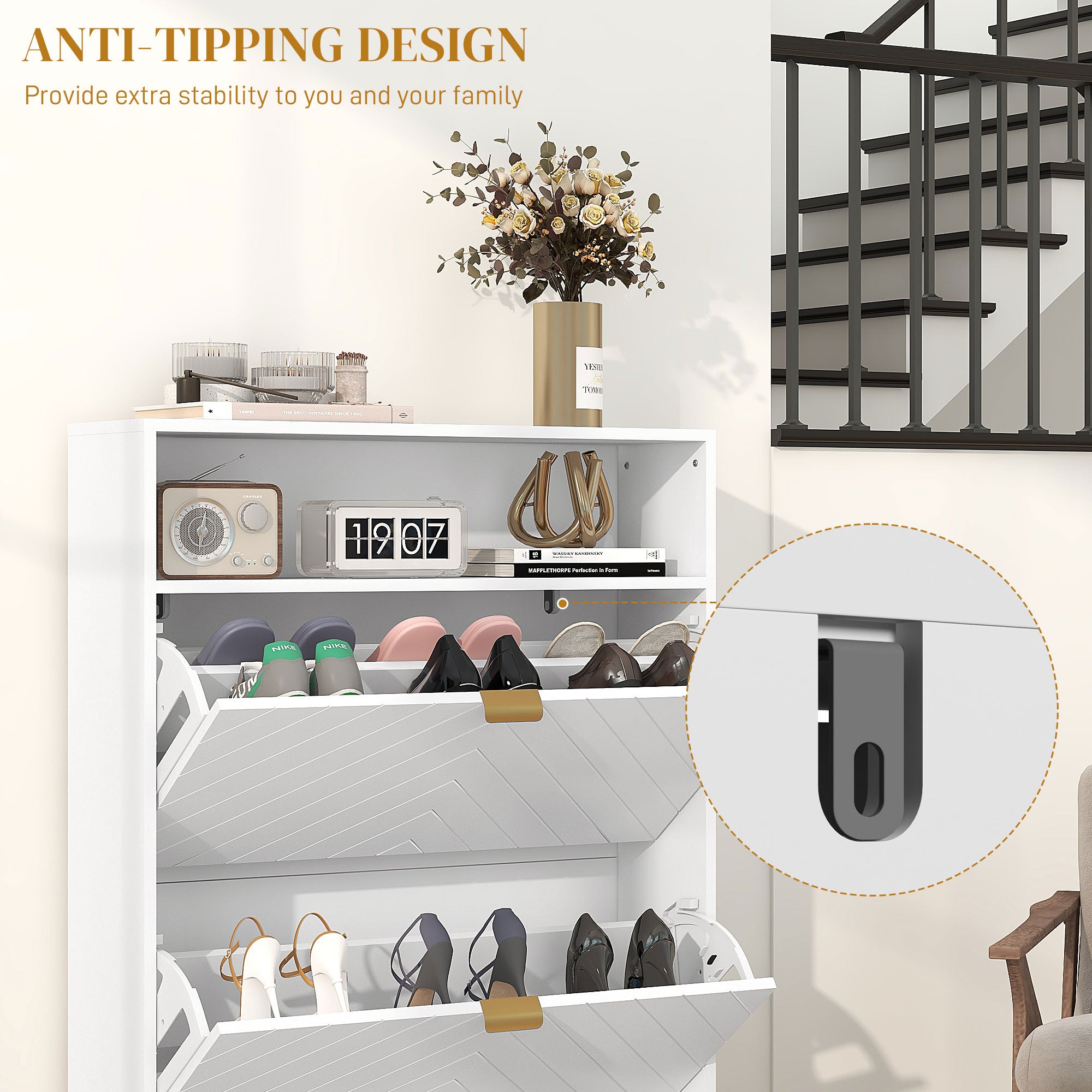 Safeguard footwear from dust and dirt, whilst giving them a permanent home with this shoe cabinet. Two flip drawers hold up to 12 shoe pairs maximum size UK 9; the adjustable inner shelf caters for larger footwear. Display your favourite decorations on the top shelf. Slim shoe cabinet comes with anti-tipping straps to safely attach to a wall.