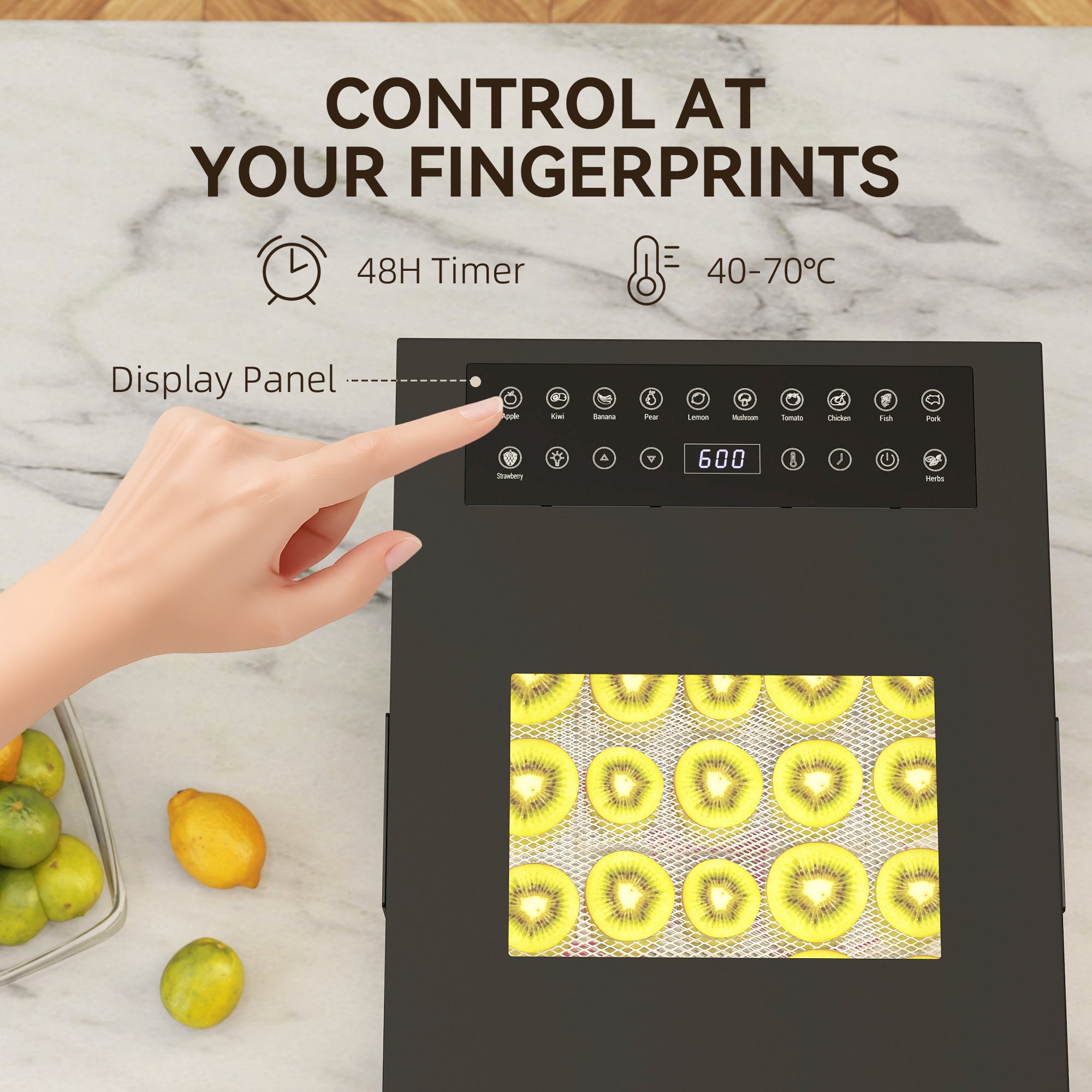 Easy, customisable homemade snacks, with this food dehydrator. It has 12 stainless steel trays: plenty of room for ingredients; also easy to separate to avoid cross contamination. It's fitted with a powerful rear air outlet to ensure even and efficient drying - so the ingredients comes out the same. Adjust the temperature between 40°C-70°C, and use the 48-hour timer to get the perfect garnishes every time. Complete with inner lights to see inside easily.