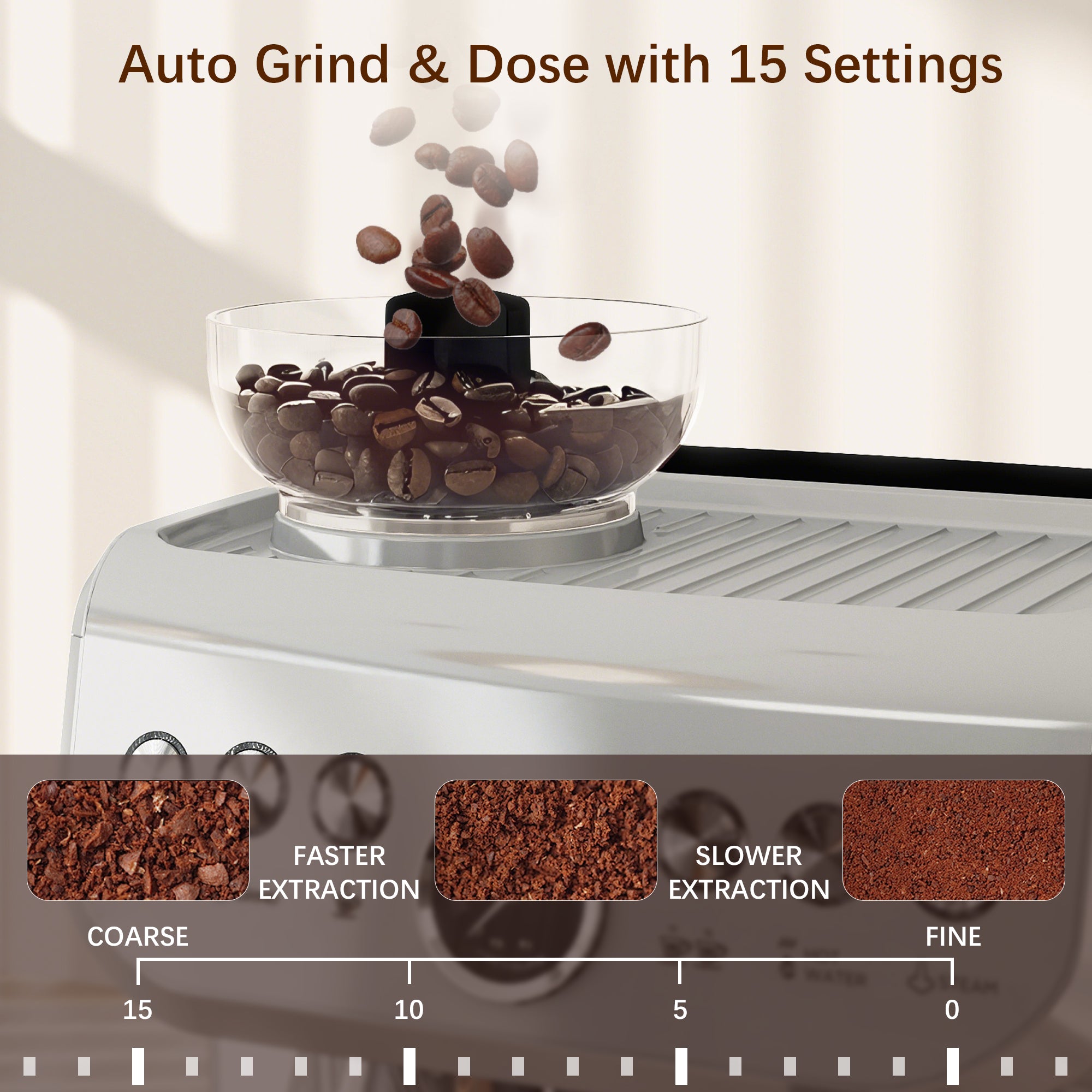 Create professional coffee, all in your own home with this automatic coffee machine. Look to the steam wand for frothy milk, with the 15 grind options giving you plenty of choice in how course or smooth you want the finish. With the 15 bar pressure, this coffee machine gives you a delicious beverage, everytime. Comes with all the parts you need.