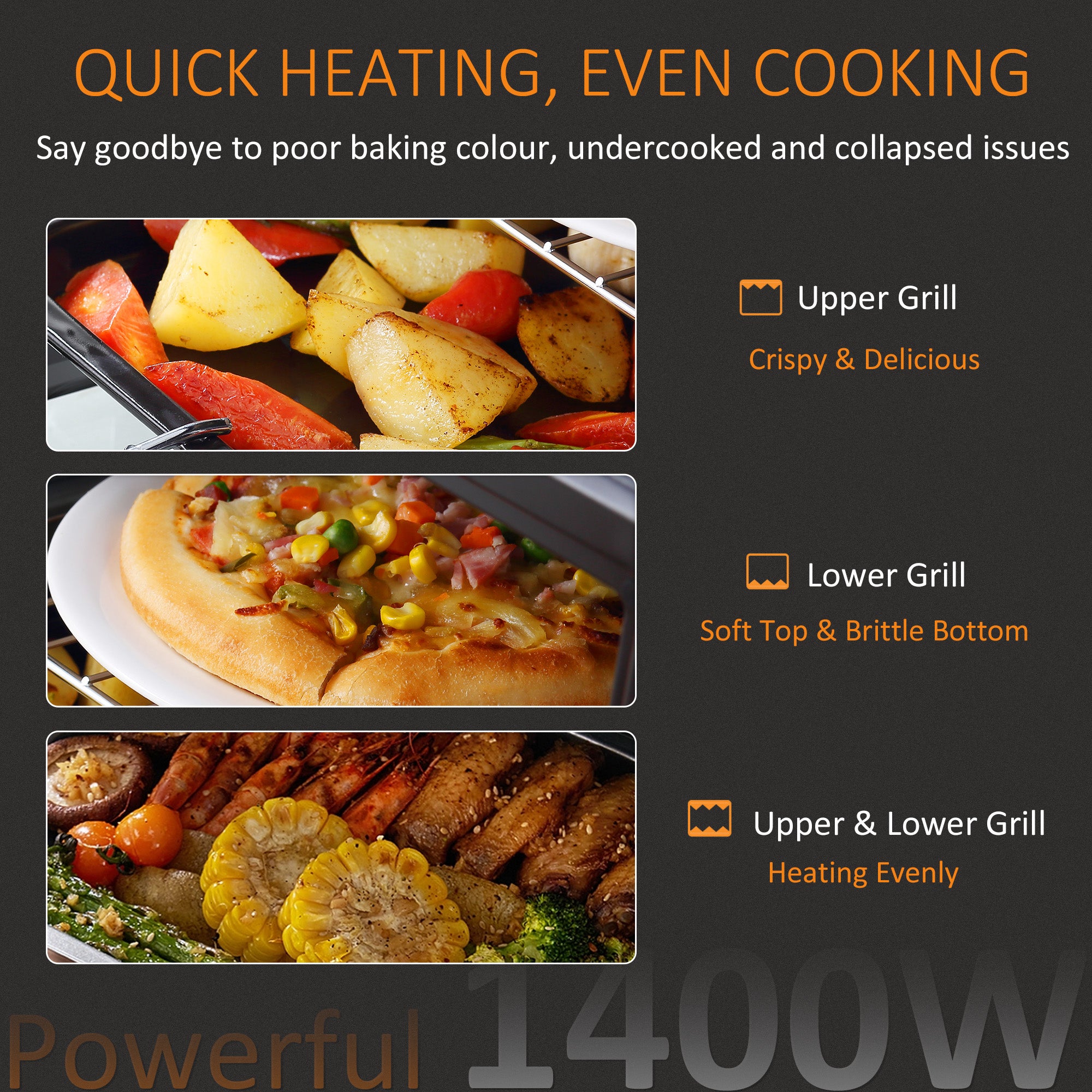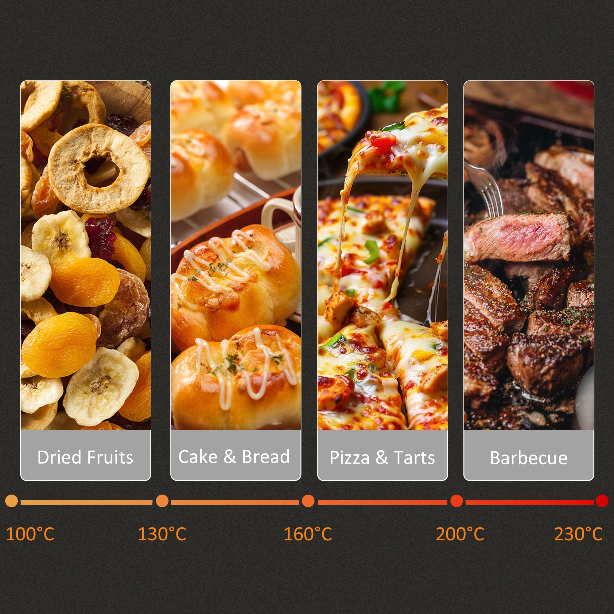 - 100°C-230°C adjustable temperature. Heat source can be changed between top, bottom, or both directions