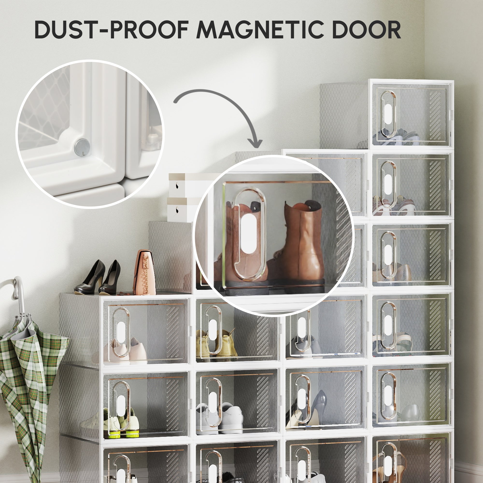 Tired of shoes cluttering your home and gathering dust? Our clear shoe boxes offer a customizable design with 18 cubes that can be arranged in any configuration. The cutout design on top allows for secure stacking, making it easy to fit in any space. With transparent plastic, you can quickly find what you need. A practical and stylish addition to your home!