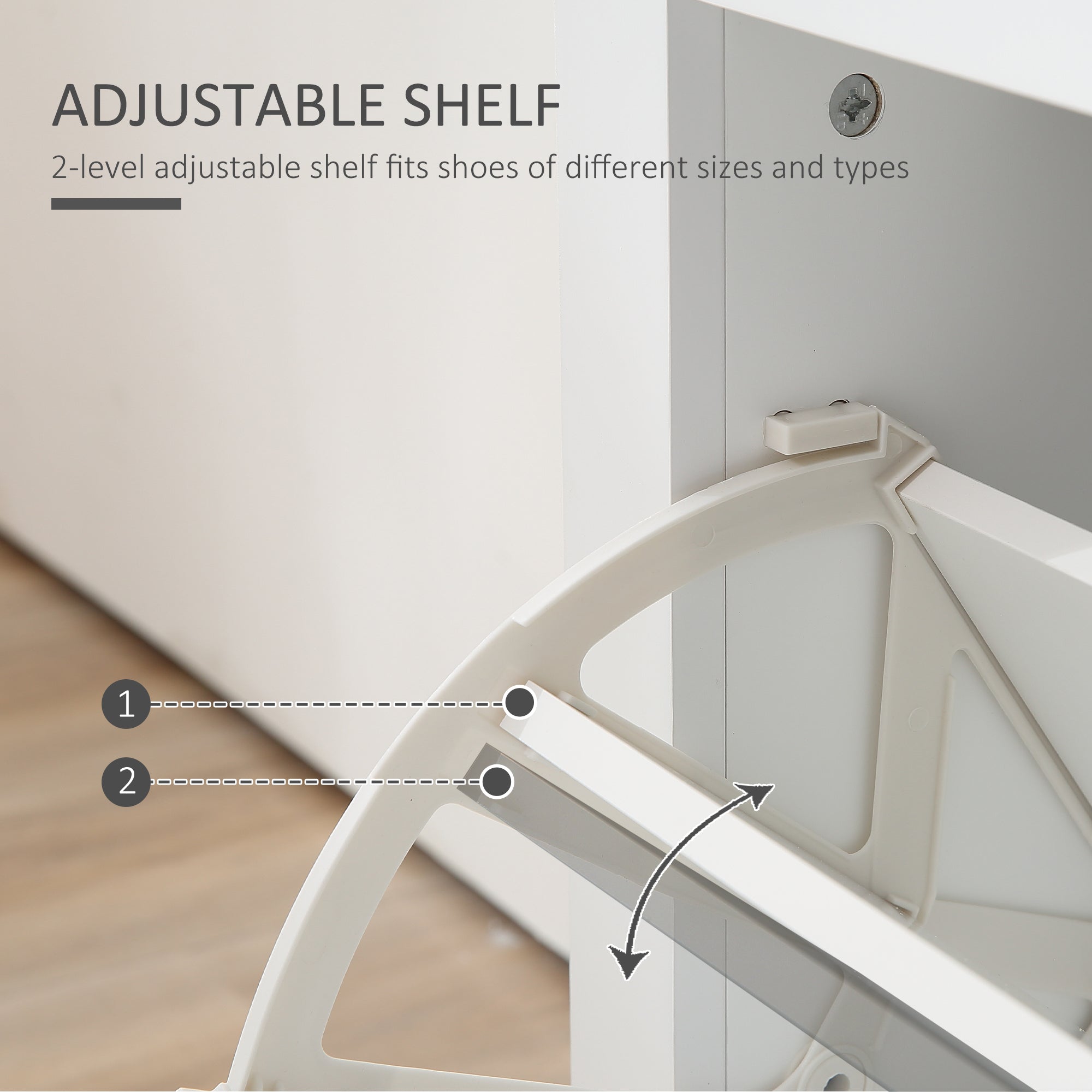 Too many shoes and nowhere to keep at home? Then it's time to keep them organised - look to this cabinet. It comes with two tipping drawers; each hold six pairs each, with an adjustable shelf in each for more flexibility. Each tipping shelf comes with two metal handles to open and close easily. White in colour and clean boxy in shape, this piece is modern design which is suited for practically all home interiors. Finished with a flat top shelf.