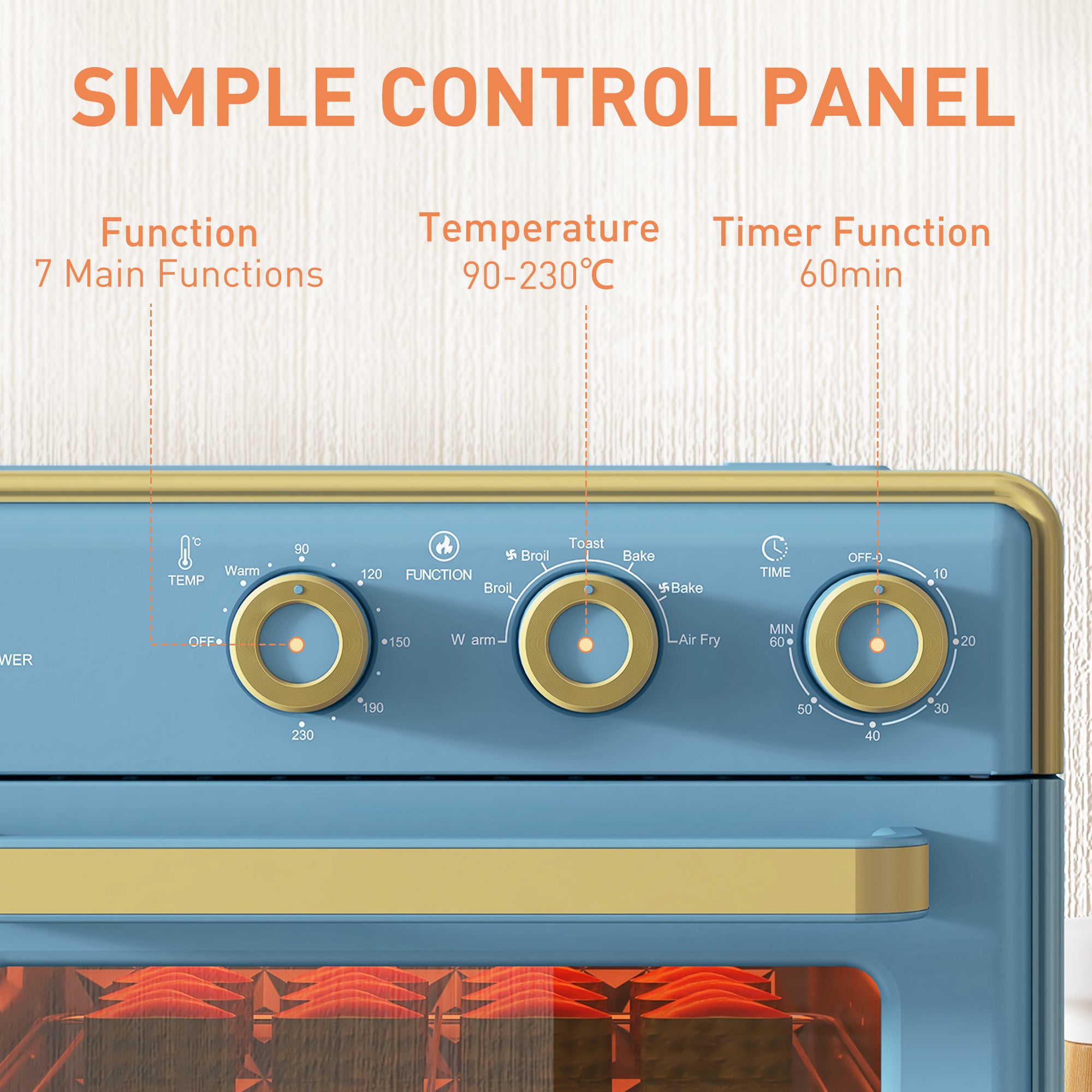 - Seven functions: warm, broil, broil (strong fan), toast, bake, bake (strong fan) and air fry