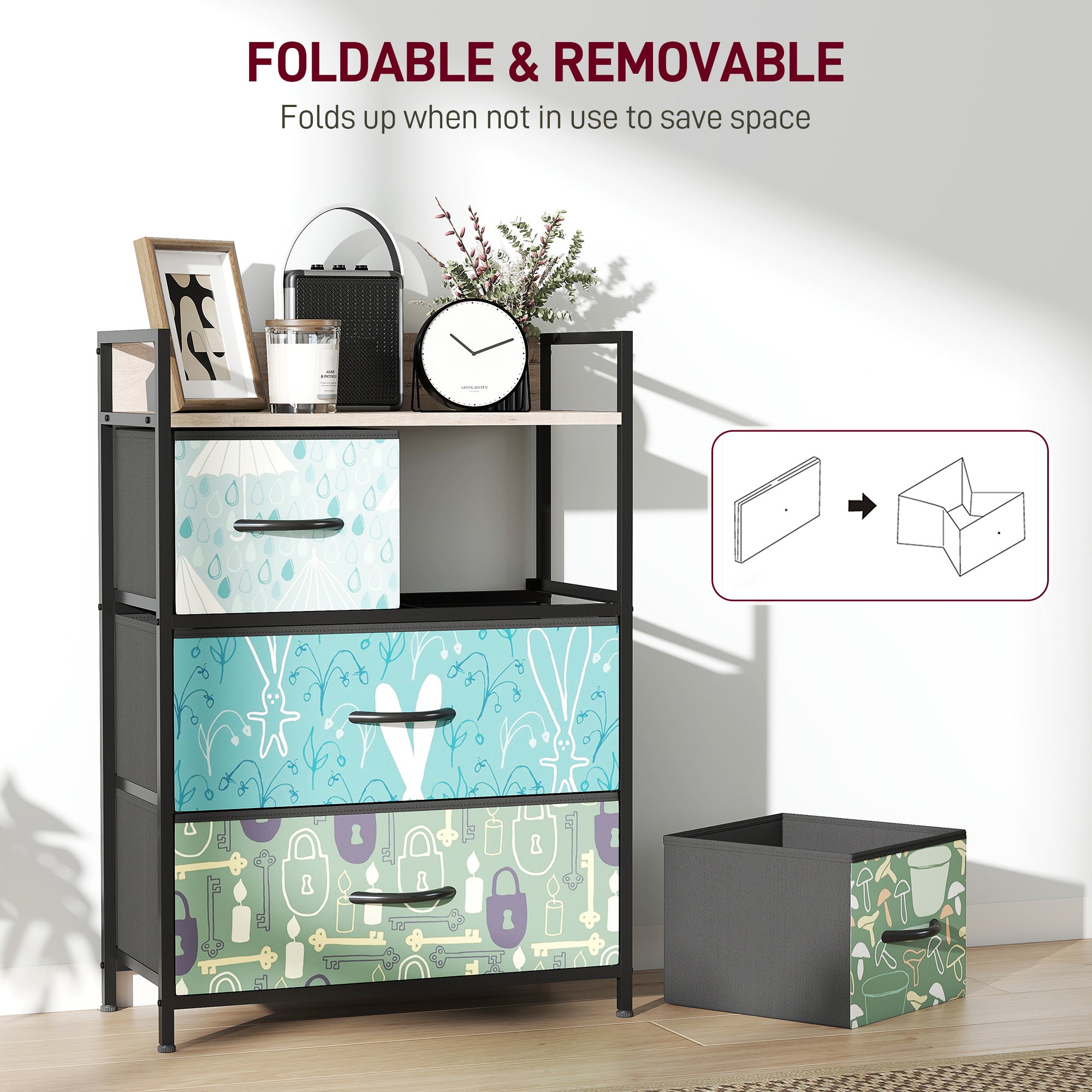 - Drawers can be removed and folded