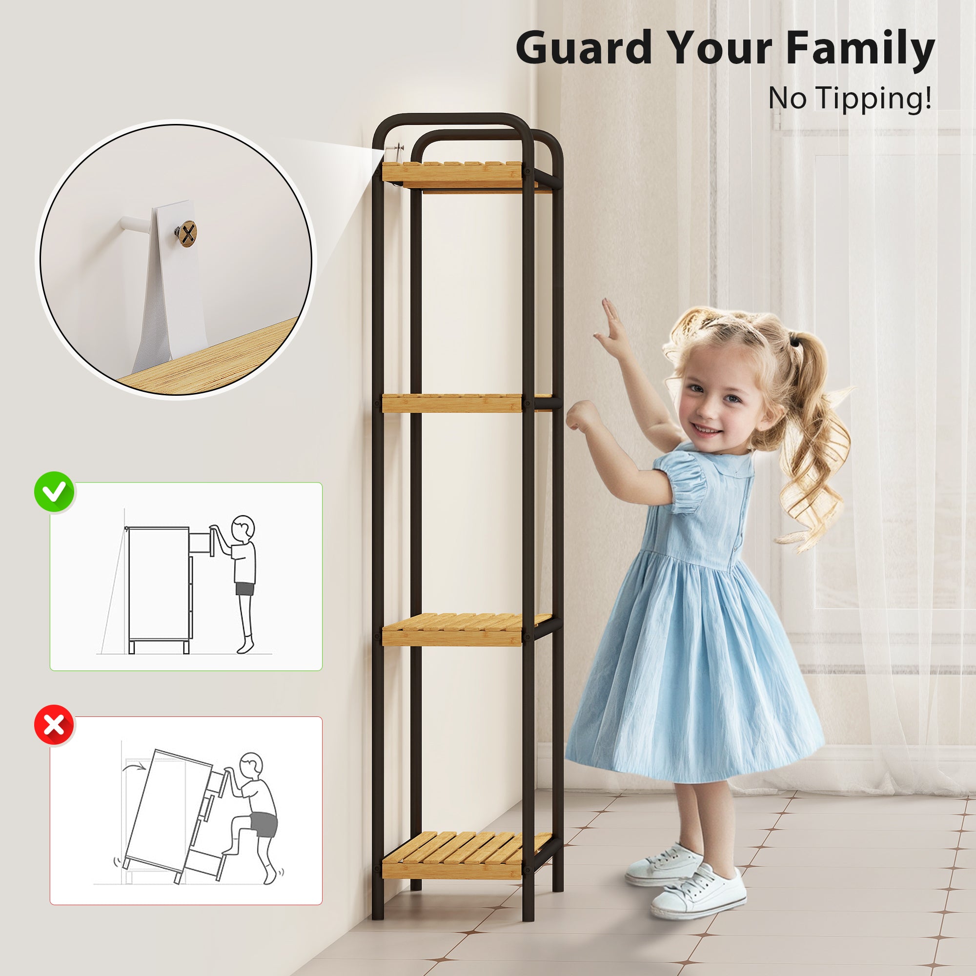 Transform your bathroom into a haven of safety and style with the freestanding bathroom shelf unit. Designed with anti-tip devices and a robust steel frame, it ensures peace of mind for families with little ones. Crafted from bamboo and steel with fresh varnish, it blends durability with natural aesthetics. Its four-tier slatted shelves offer lots of space to keep essentials organised and elevate your living experience.