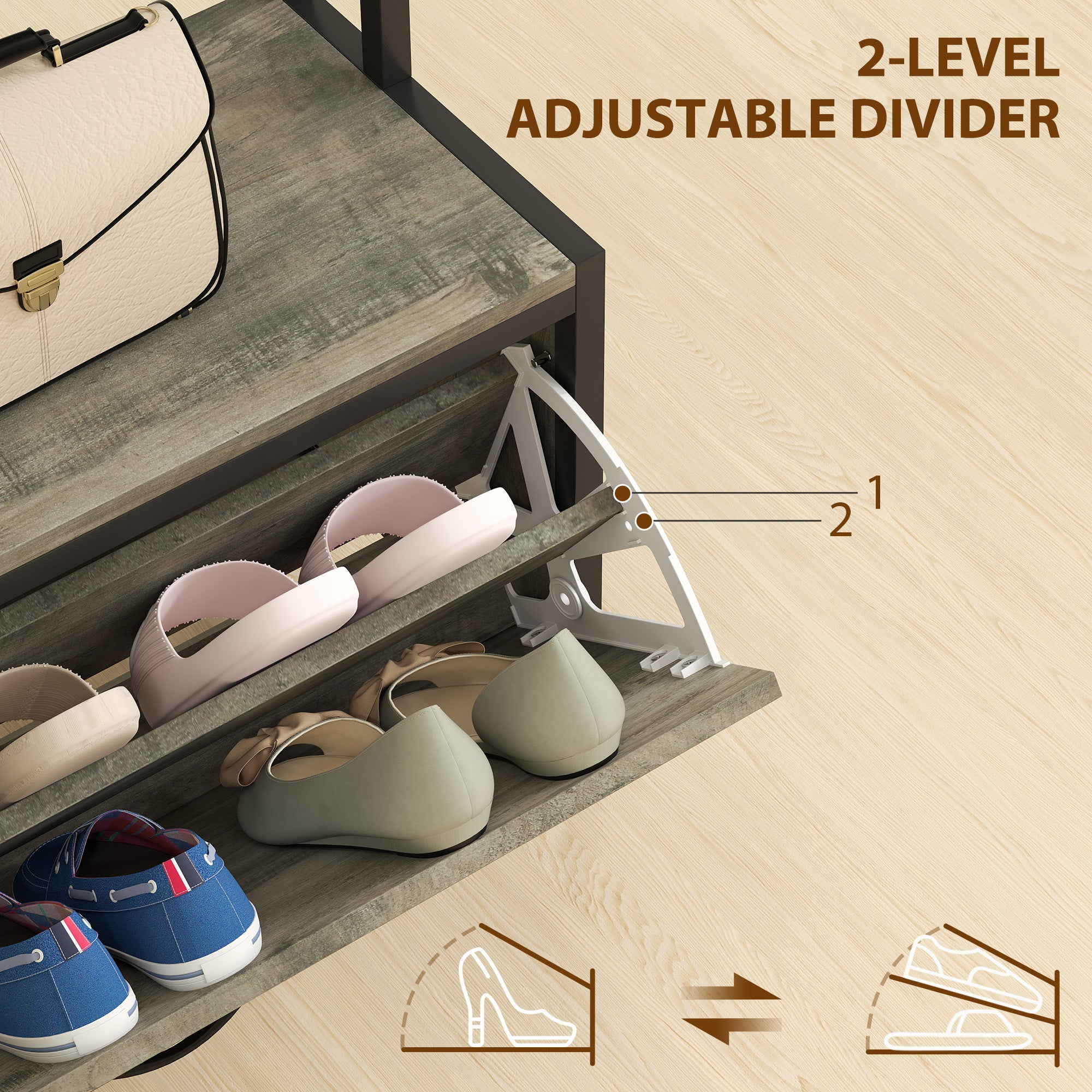 - Shoe cupboard with a two-level adjustable divider to fit in larger footwear