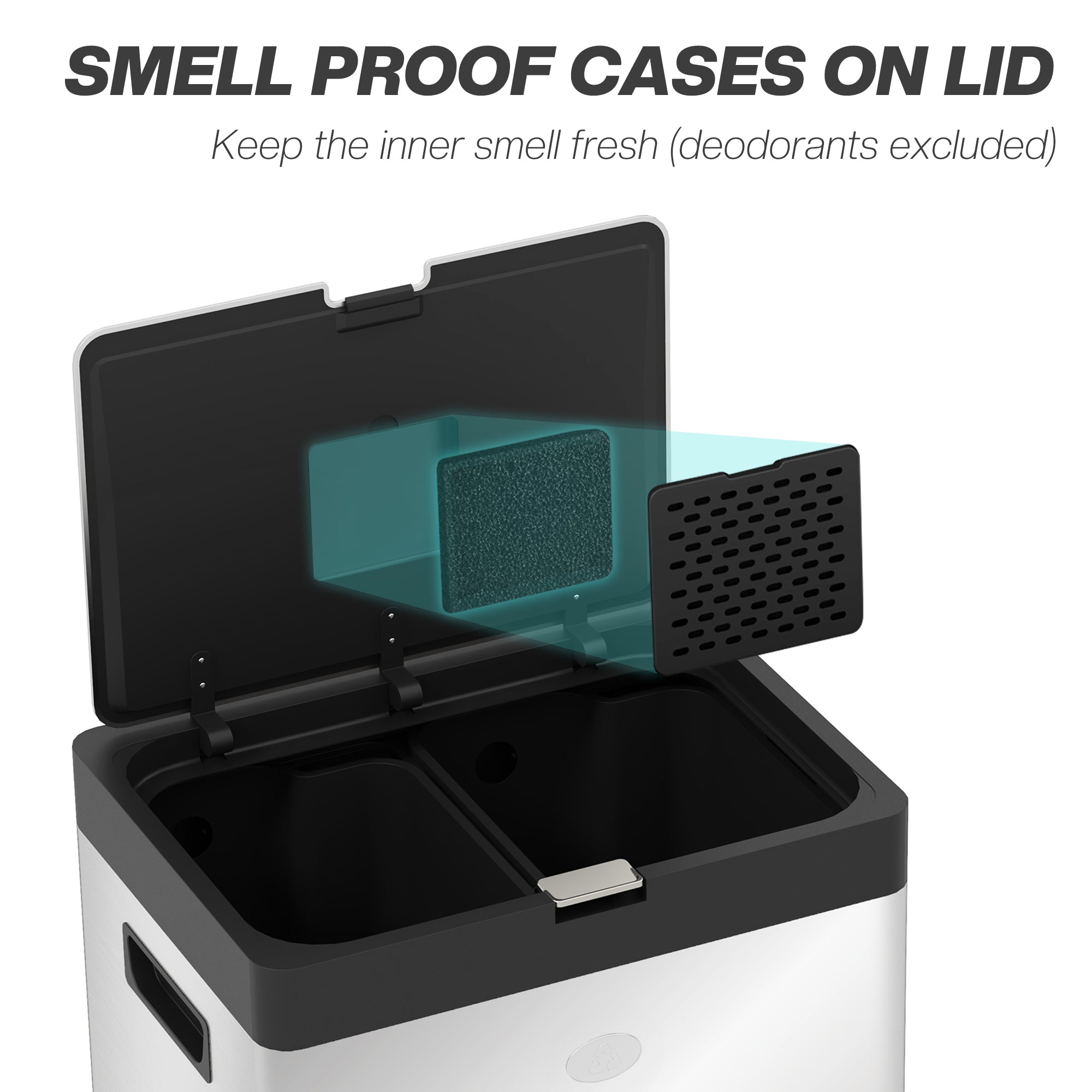 Discover the ease of sorting with the bin with lid, a triple bin featuring a 3 compartment system (two 18L and a 20L) that keeps your space tidy and odours at bay with built-in deodoriser holder. Glide it anywhere effortlessly with its wheels and enjoy the sleek, fingerprint-resistant stainless steel finish. Great for any bustling kitchen!