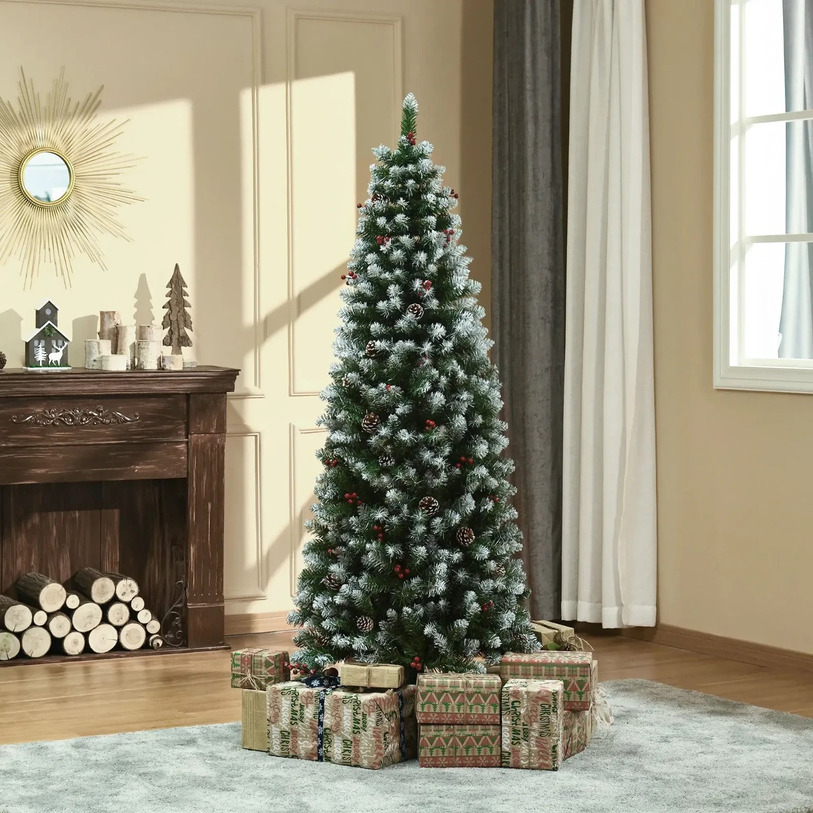 6ft Artificial Christmas Tree Bushy Red Berries Pinecones Snowy Xmas Pencil Tree