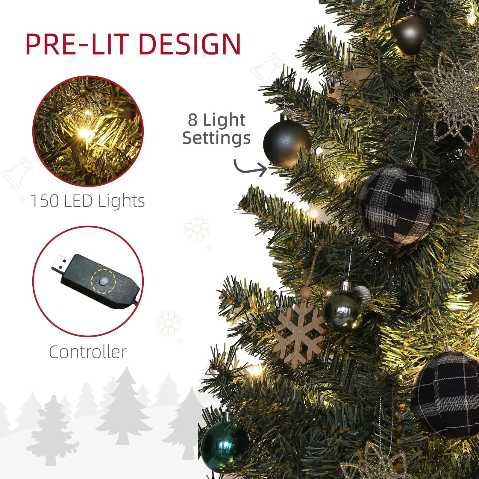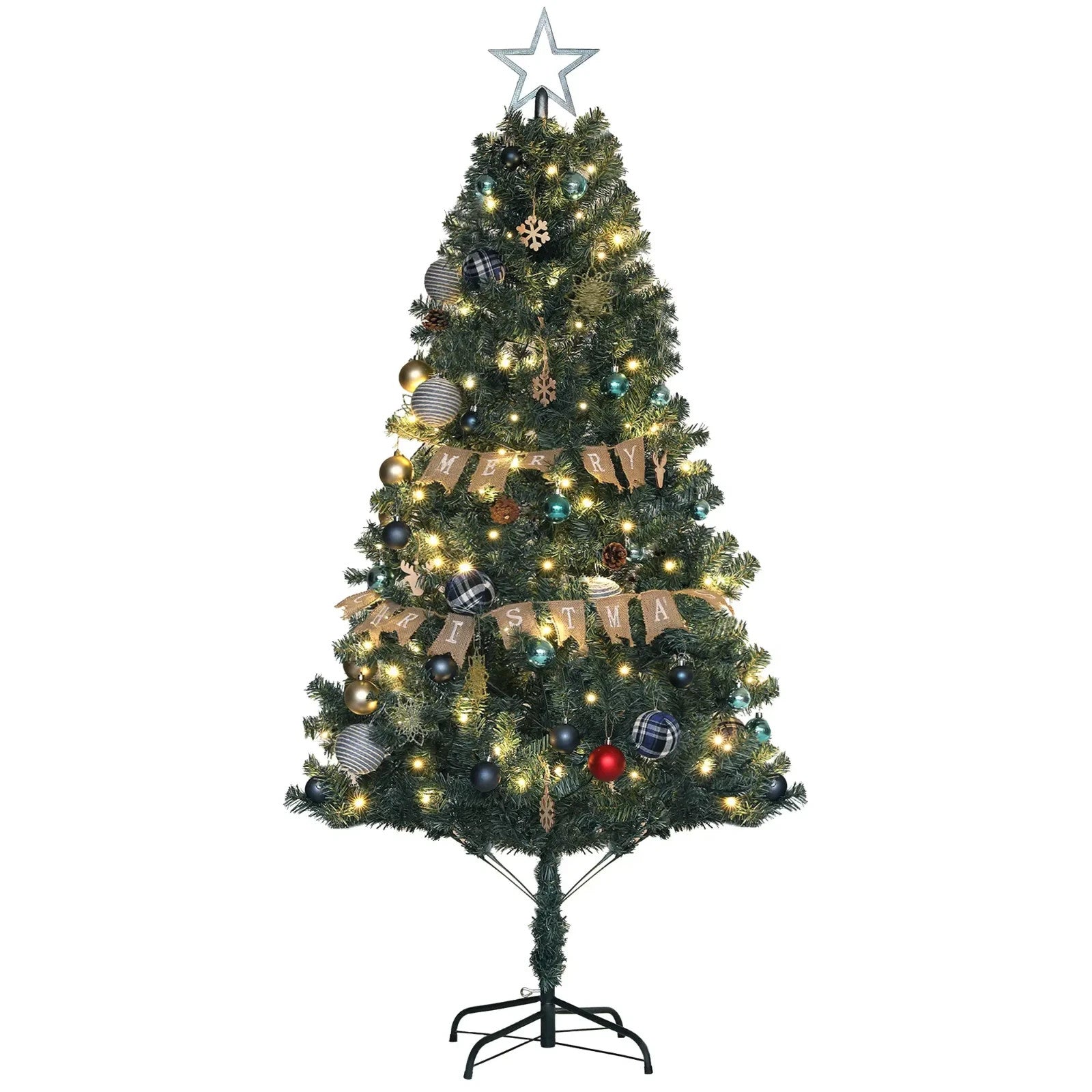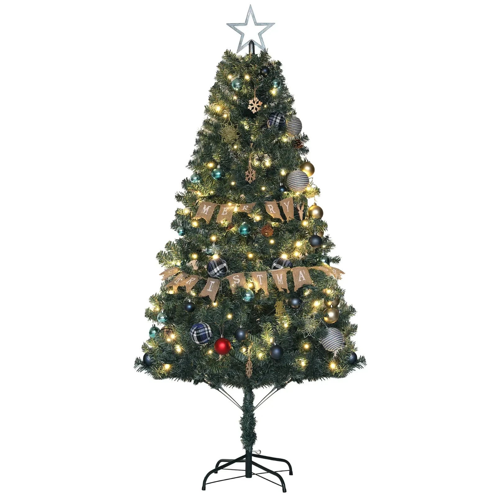 Go the extra mile this festive season with this pre-lit christmas tree. Made from flame-retardant plastic, this fake christmas tree is safe for use in your home. The warm white LED lights flick between eight modes, so you can choose the vibe of the illumination to suit you. Equipped with a 'MERRY CHRISTMAS' ribbon, top star, pine cones and decorative balls, this LED Christmas tree adds a sparkle to your celebrations. Complete with a steel base to stand steady.