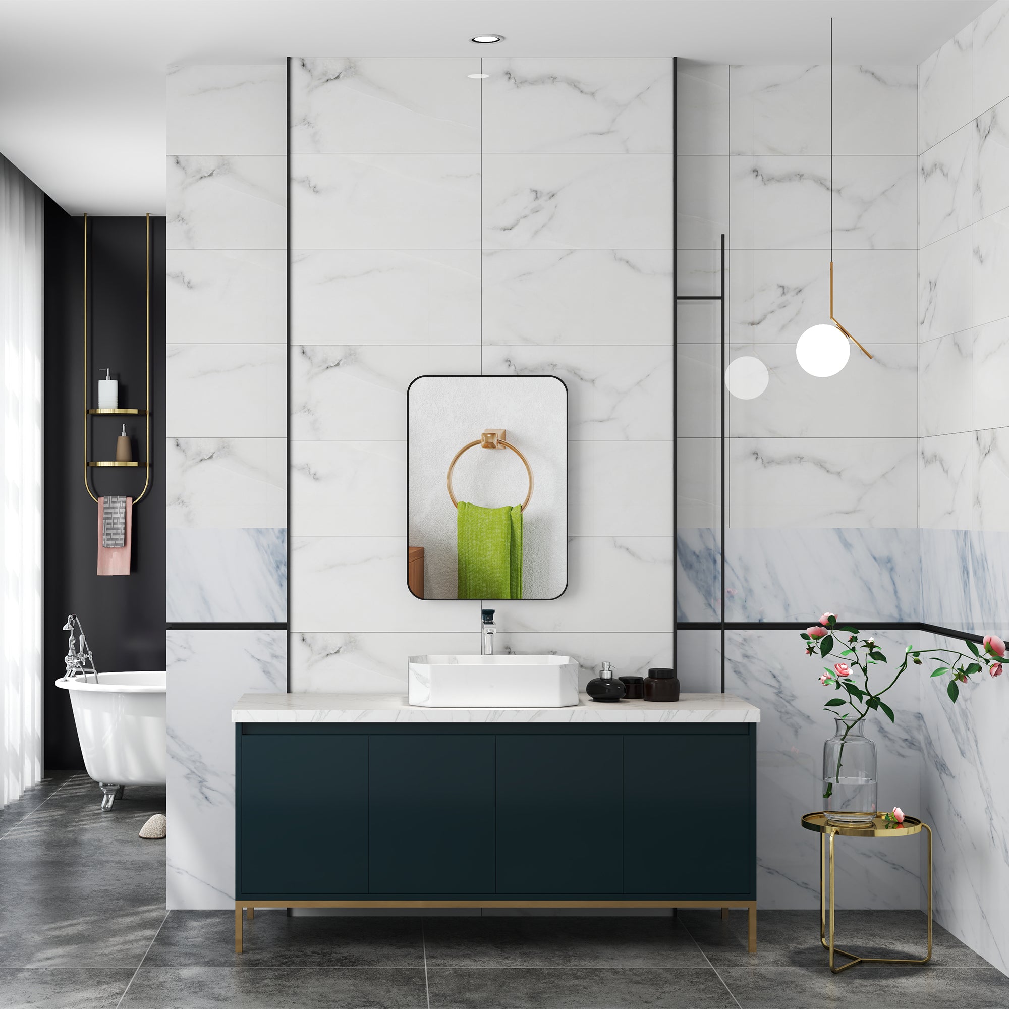 The bathroom mirror is an essential for every home. Hang this 70 x 50cm mirror either vertically or horizontally - hang it your way. The powder coated metal frame is strong, in a curved corner shape for a soft, welcoming look. HD glass means a clear reflection, finished with shatter-resistant film on the back for safety.