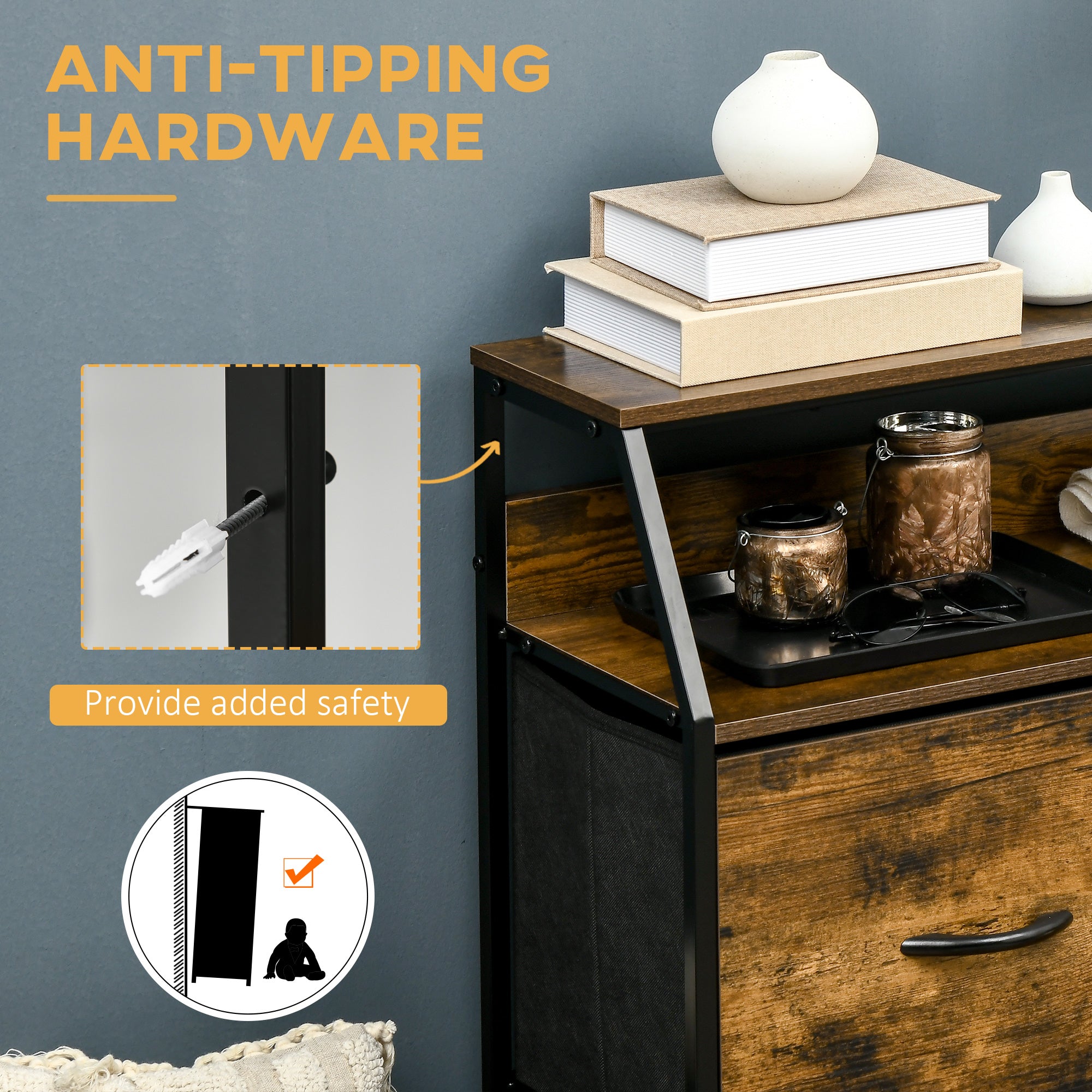 Quick additional storage is always needed. Get yourself clutter-free with bedroom drawers. The removable fabric drawers with rustic colour MDF panels delivers a casual look to your living space. At the same time, the dresser with open shelf and concealed storage provide a versatile storage solution. The frame, made from steel, ensures a sturdy core structure, with adjustable feet to keep the balance.