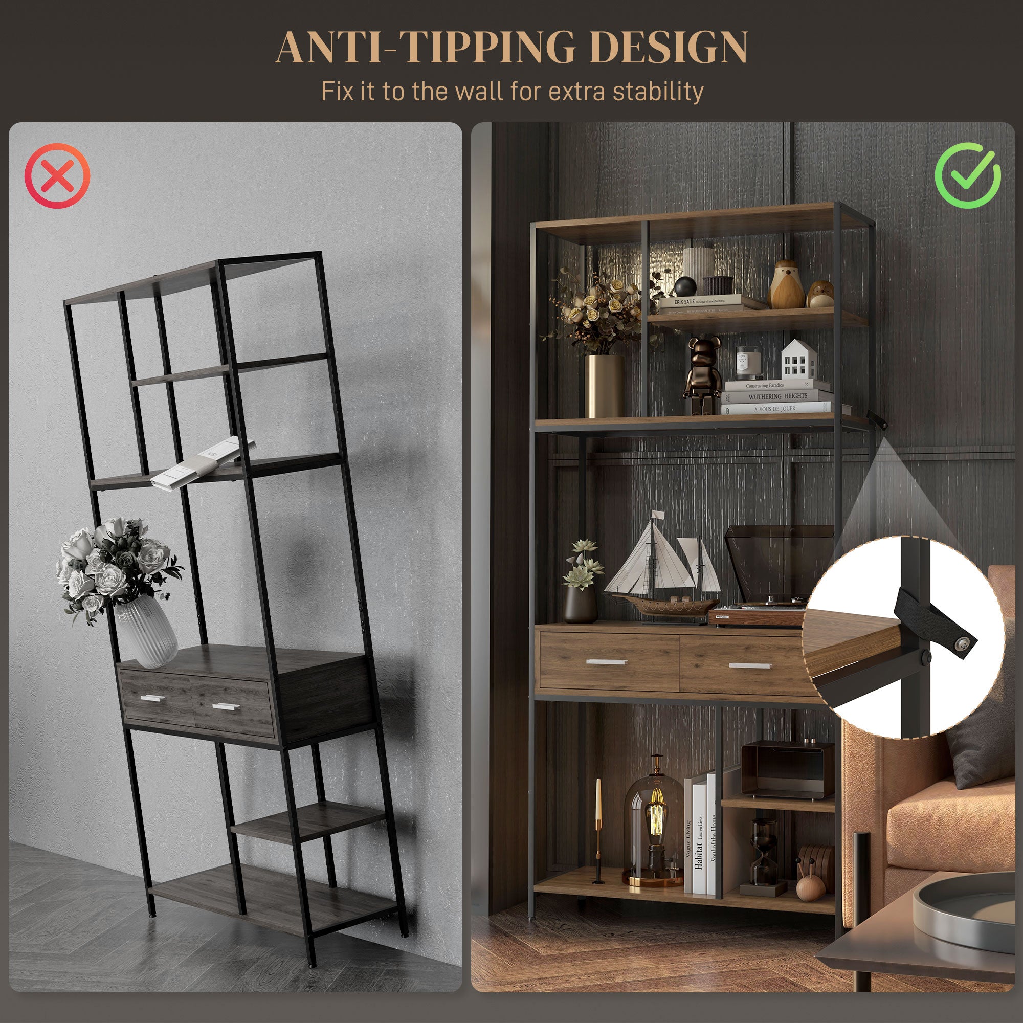 - Two drawers and multiple shelves provide plenty of room for storing and displaying items