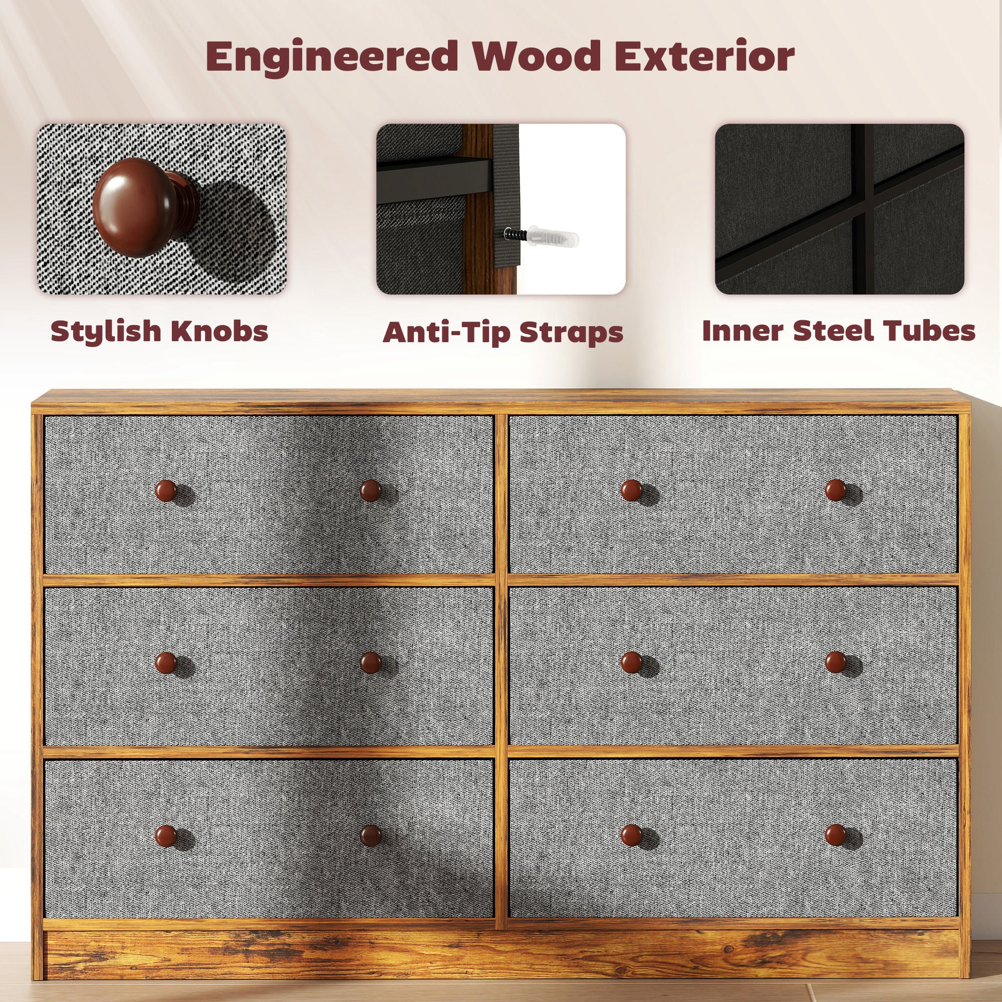 Bring style and order to your bedroom with this chest of drawers from. Featuring six foldable fabric drawers, it makes sorting clothes like T-shirts, jeans and socks simple. The two-tone design, grey and rustic brown wood-effect, brings a stylish look. The MDF and steel frame ensures stability, while anti-tip straps add safety. Transform your space into a serene haven with this dresser.