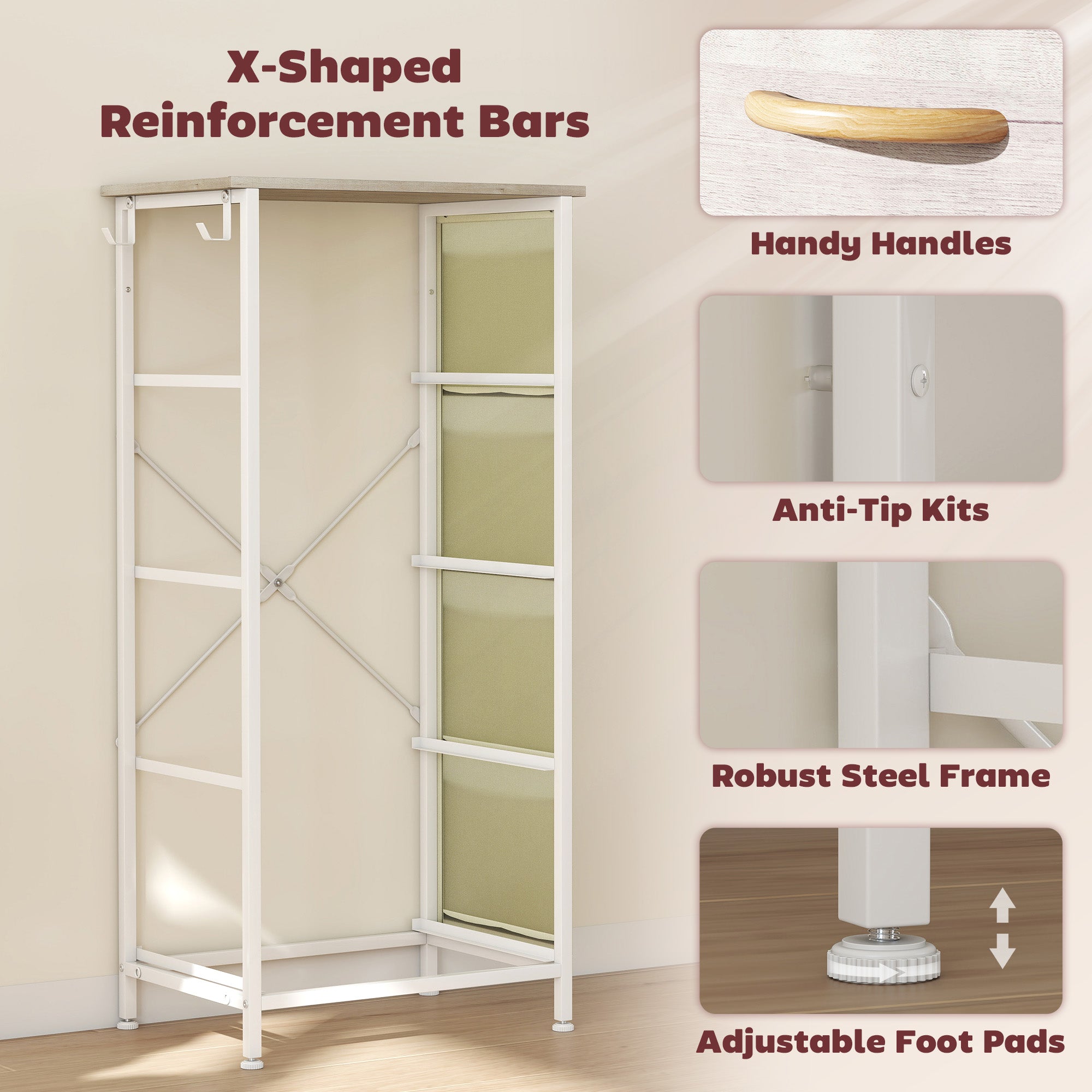 Easy, simple storage with this fabric chest of drawers. With four same drawers, it's easy to sort everything from socks to pants. It also features four side pockets and two hooks to get smaller accessories altogether. A steel frame with X-bars keeps this bedroom dresser stable, finished with adjustable feet for balance - even on unsteady grounds.