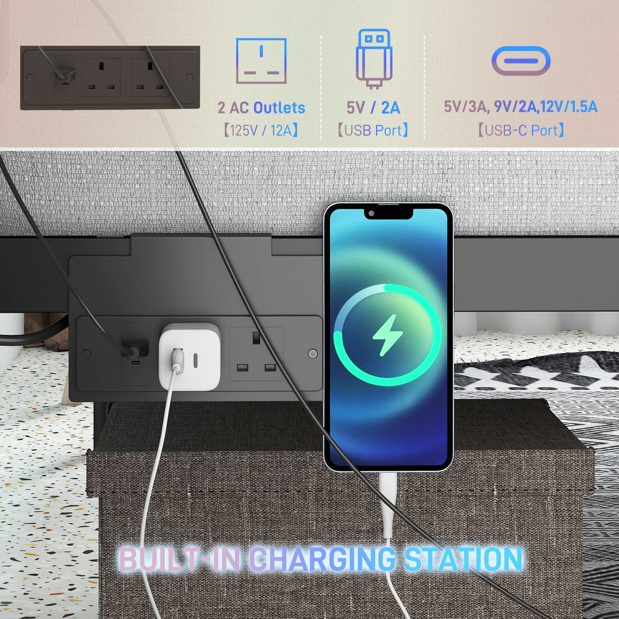 Transform your bedroom into a vibrant oasis with double size bed frame, featuring customizable RGB LED strip lights. Tailor the ambiance via Bluetooth or APPâ€â€choose your colour, brightness and mode to suit your mood. Plus, stay connected and powered up with built-in charging stations, including AC outlets, USB and USB-C ports. This double size bed base combines tech with comfort for a truly modern sleeping experience.
