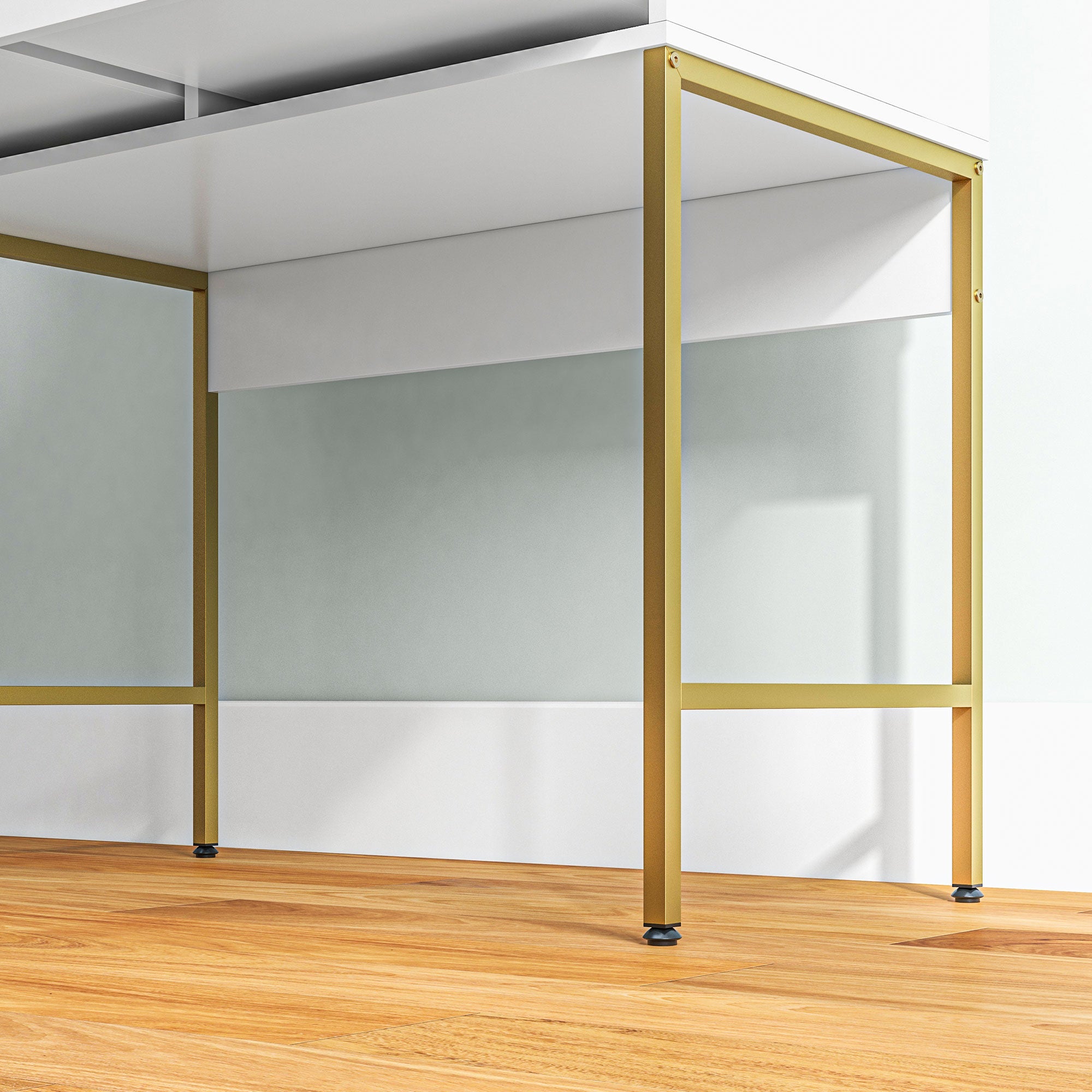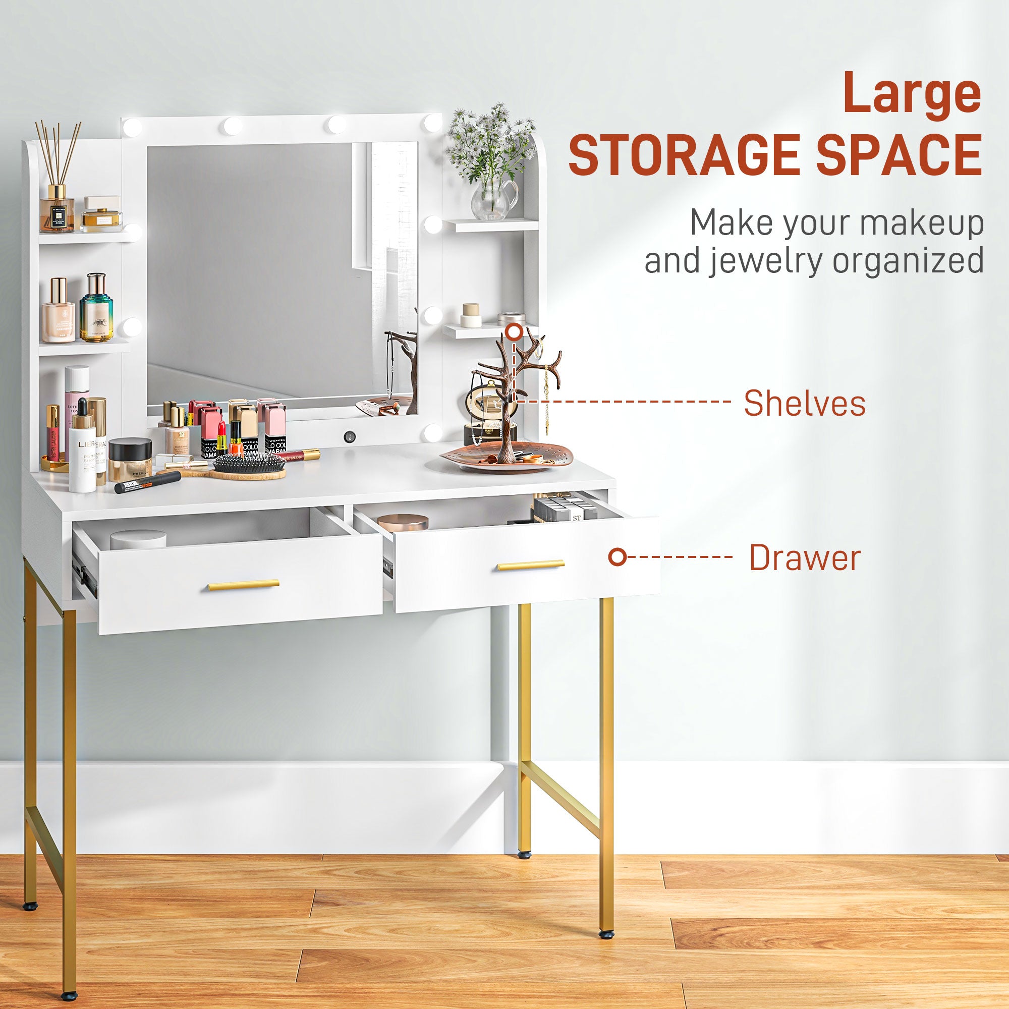 Make-up routines, at any time of day gravitate around this makeup desk set. Around the large mirror, there are 10 warm white Hollywood light bulbs. This vanity desk features a spacious tabletop, two smooth-sliding drawers and six upper shelves - plenty of room for keeping make-up and beauty products conveniently next to you as get ready.