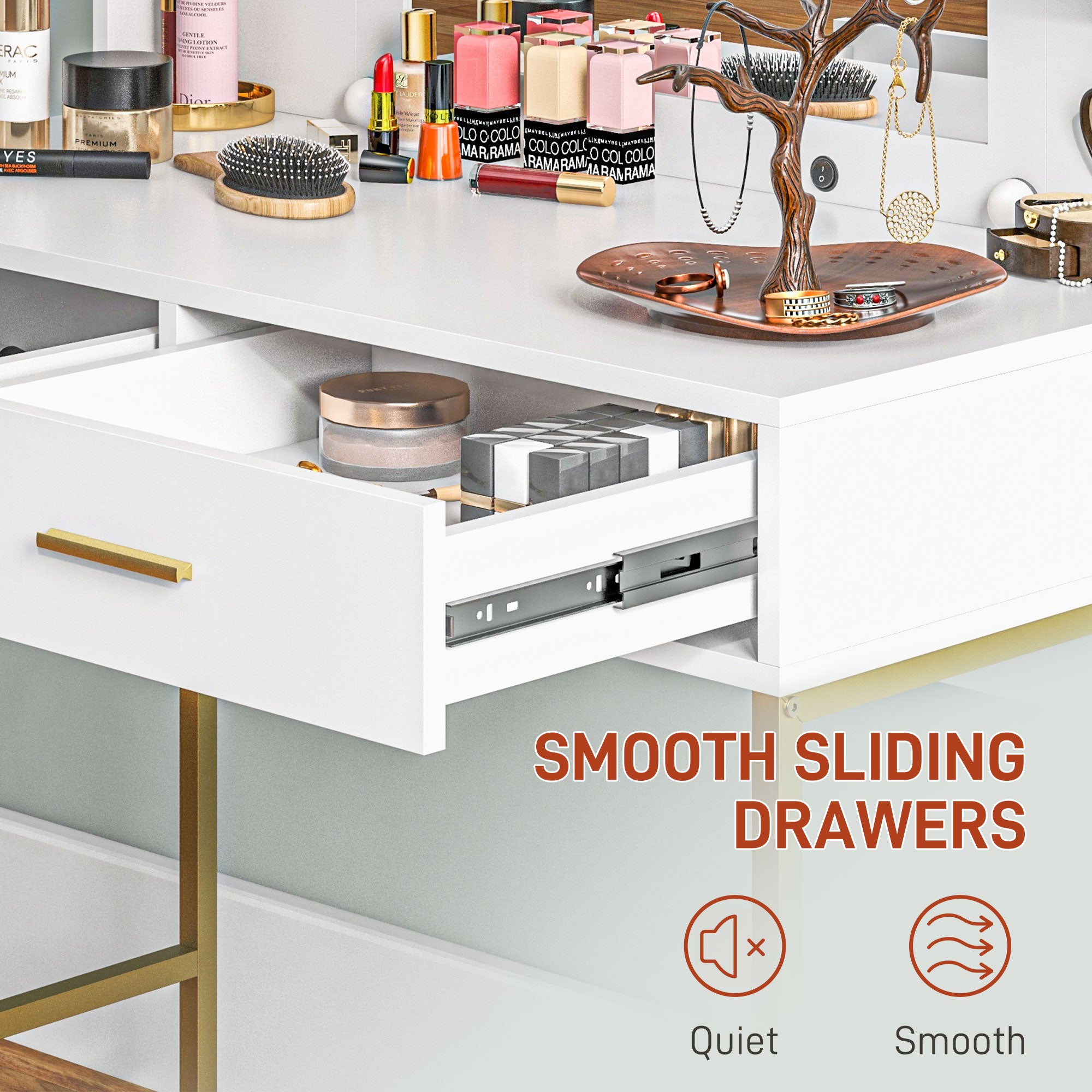 - Smooth sliding drawers are quiet