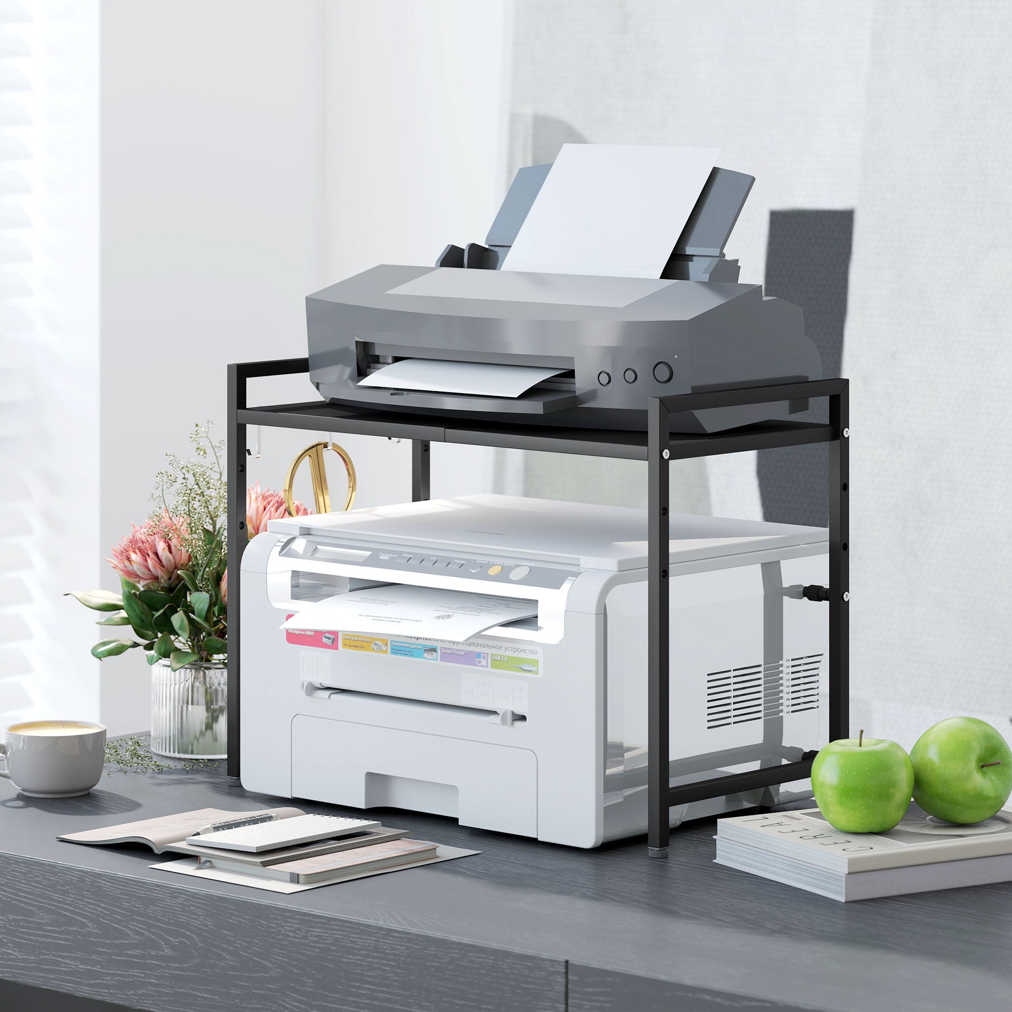 Upgrade your kitchen with the microwave oven rack, a modern storage solution designed to keep your space tidy and organised. With a 40 cm bottom space, it comfortably fits most appliances and the trio of hooks keeps your utensils handy. Extendable from 39.5 to 64 cm, this baker's rack doubles as an elegant coffee station, blending seamlessly into any decor.