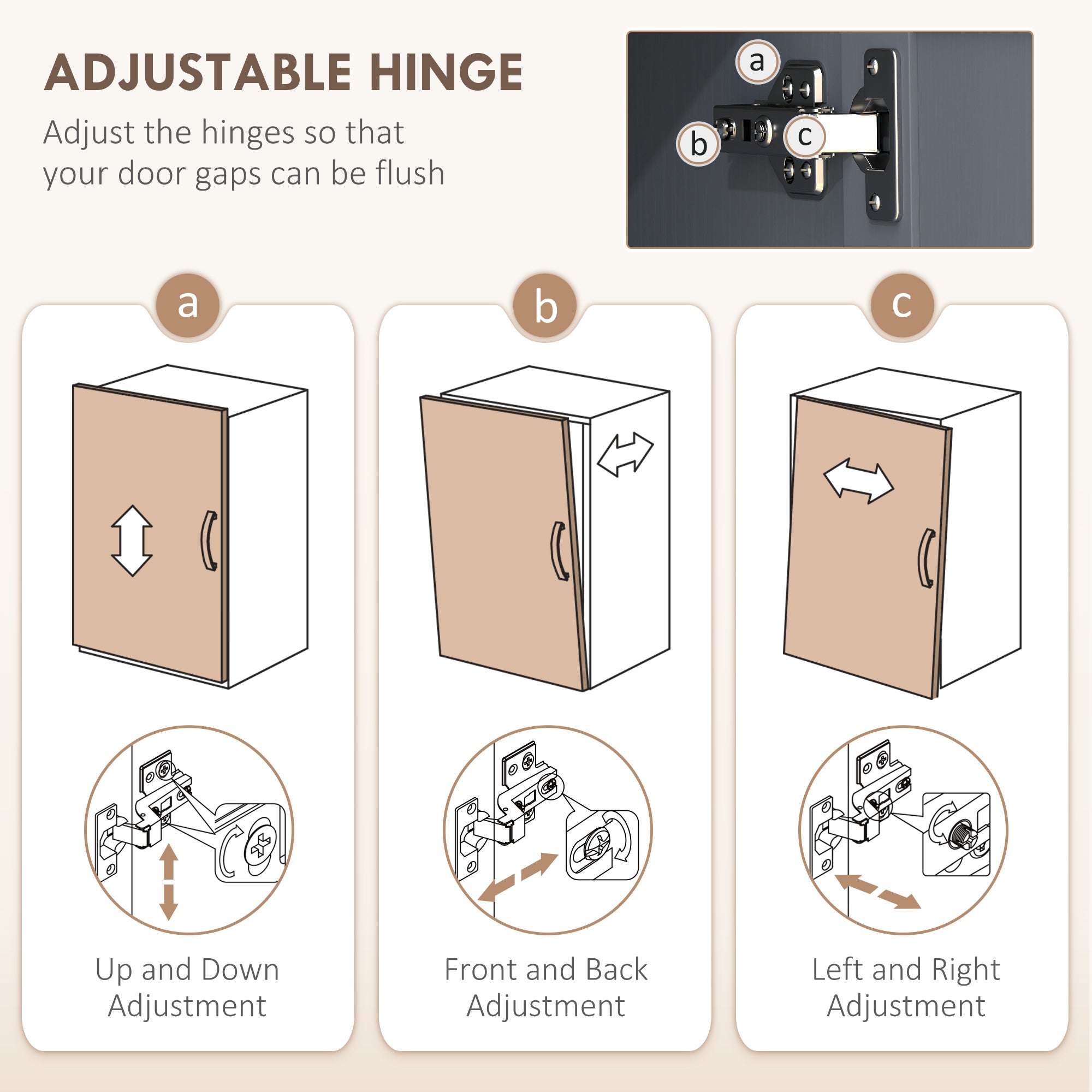 - Four individually-opening doors. Adjustable hinges for in-line door alignment
