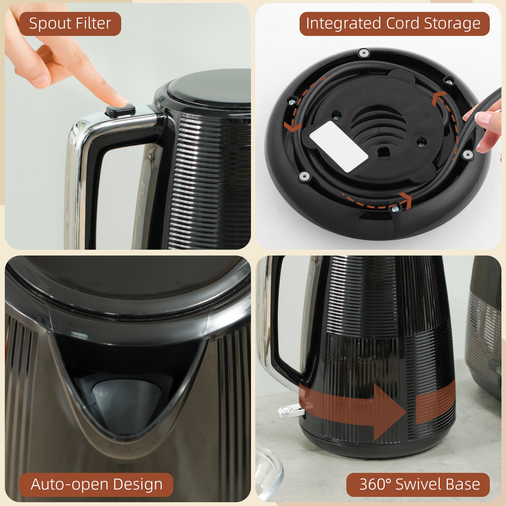 Elevate your morning routine with the Black Kettle and Toaster Set. This chic, modern duo includes a 3000W electric kettle that boils a cup of water in just 42 seconds and a versatile toaster with reheat, defrost, and seven-level browning control. Both items feature safety auto-shutoff and are designed for easy use and cleaning, ensuring a seamless breakfast experience.
