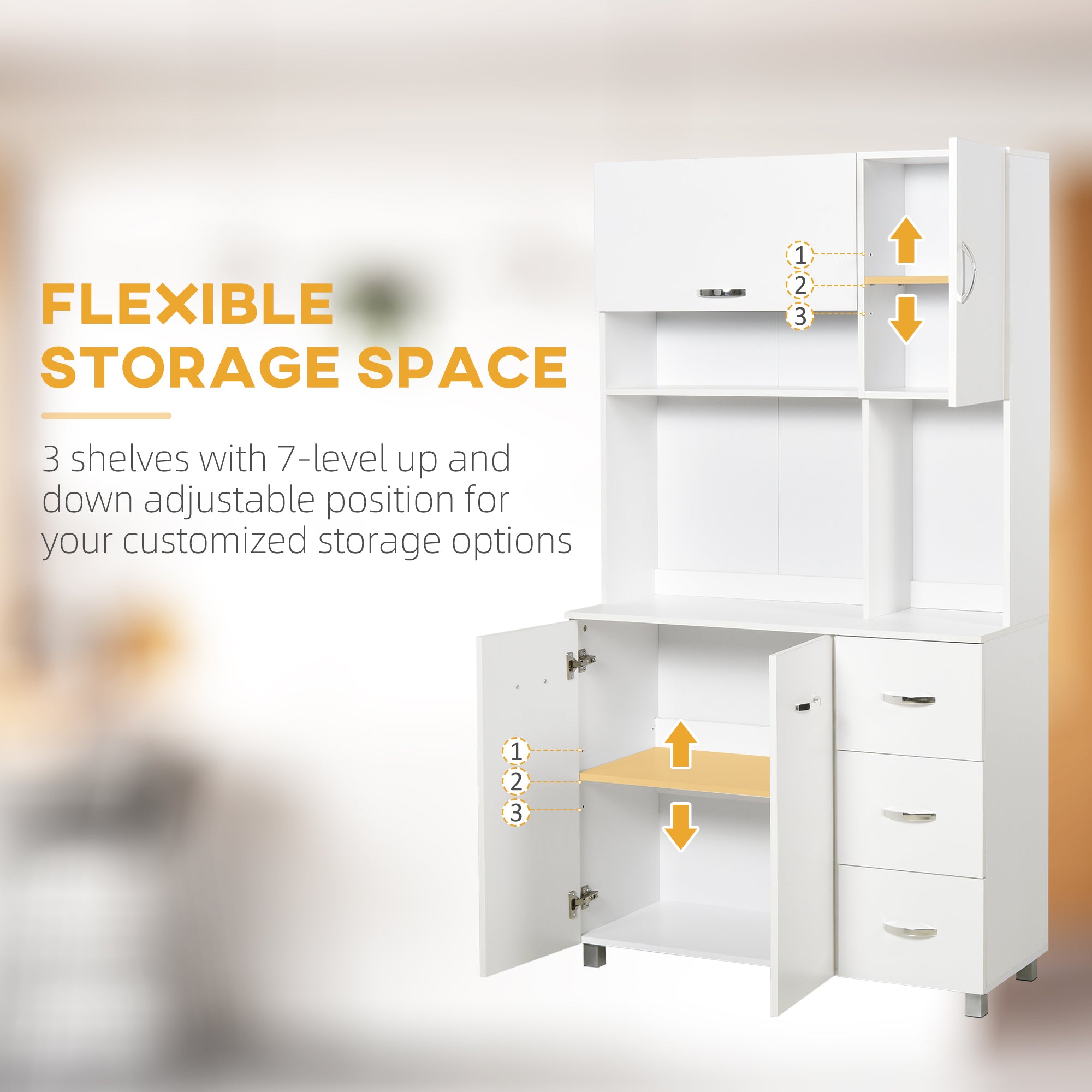 Make the most of your home space with this freestanding kitchen units from. It is made with three open compartments, three drawers, a large bottom cabinet and two top cabinets, giving you plenty of storage and display room for all your kitchen supplies. Using particle board for the structure, the pantry cupboard is tough for everyday use. Each door is fitted with a metal handle for easy opening, with the polished finish adding a sleek look to the overall white finish of the unit.
