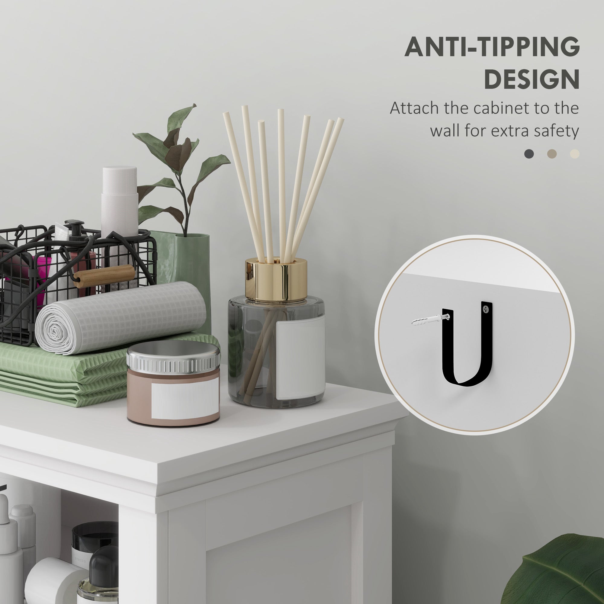 Even small spaces need an extra helping hand, so give yours plenty with this freestanding cabinet. Formed from MDF, this small bathroom storage cabinet is a solid piece suitable for everyday use. Comes with two top shelves and a bottom cupboard - enough room for all the essentials; complete with adjustable shelves for more personalised storage. The anti-tipping straps to attach to the wall for safety.