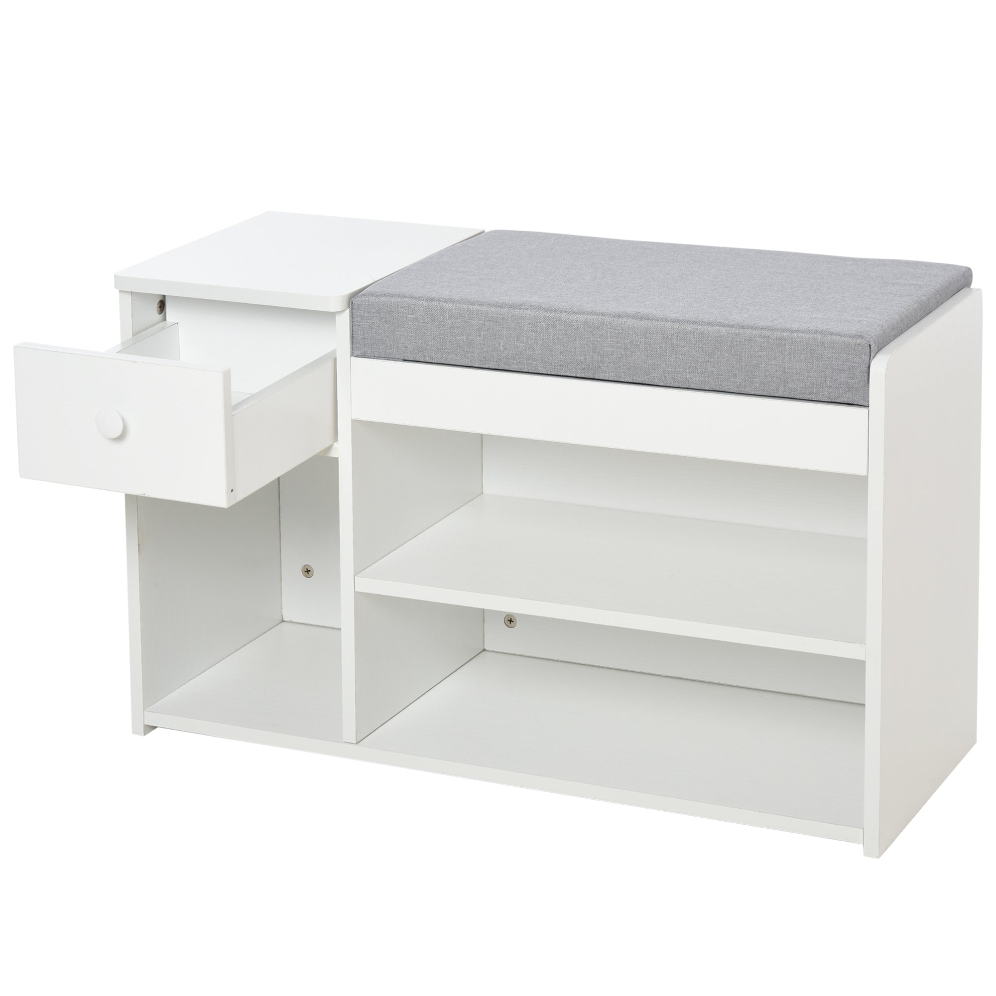 Keep the style simple and the storage spacious with this white shoe bench from. This multifunctional design features three open compartments for shoes and boots, a small top drawer for keeping small bits together and a cushion top section for sitting comfortably. Made from particle board for enhanced strength which can handle up to 150kg, it is finished with a small white handle on the drawer for easy opening and closing.