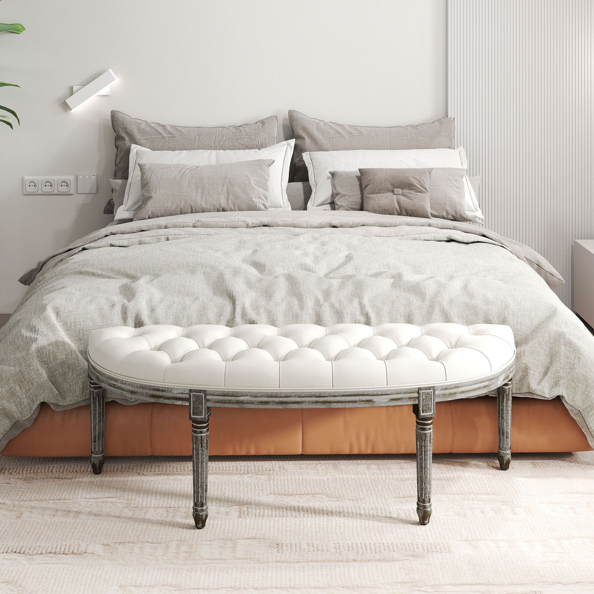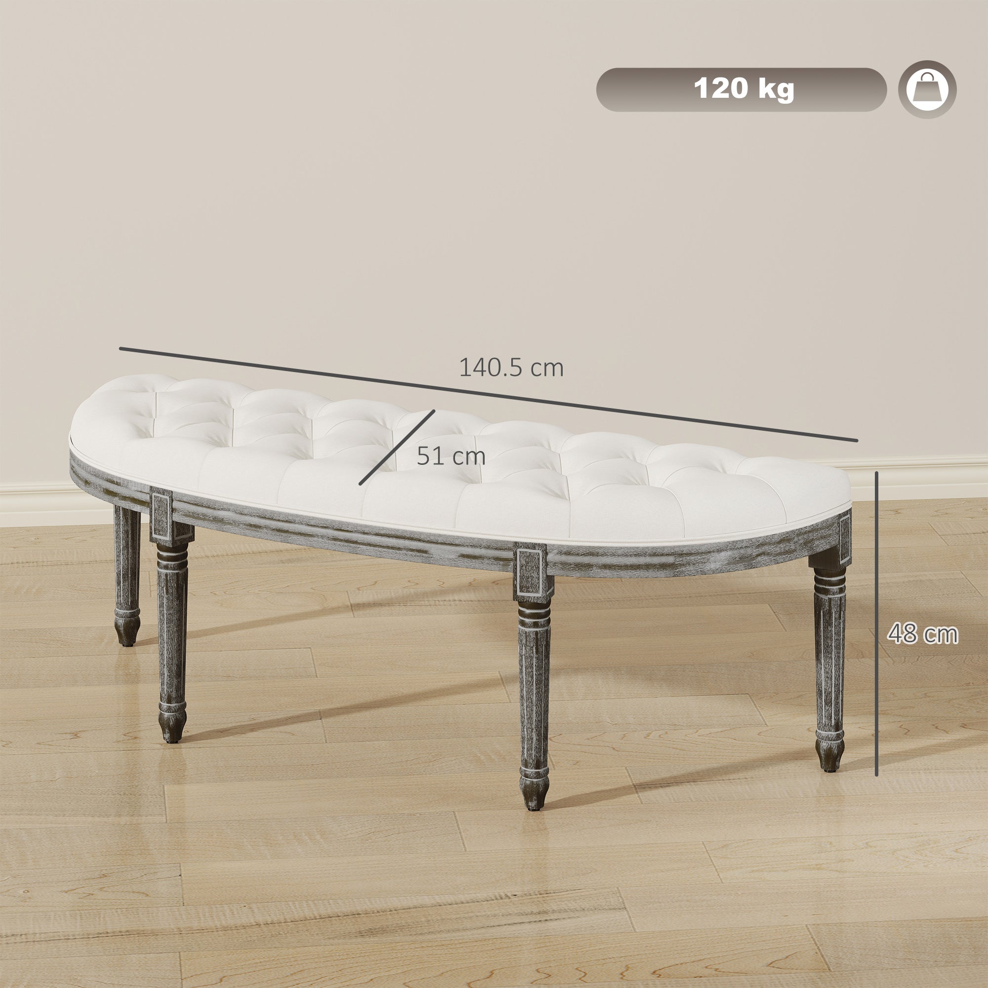 - Antique style: A half moon shape, it features button tufting all over top and a wood grain-brushed effect finish with delicate carved accents on the legs. Sophisticated and slightly vintage looking.