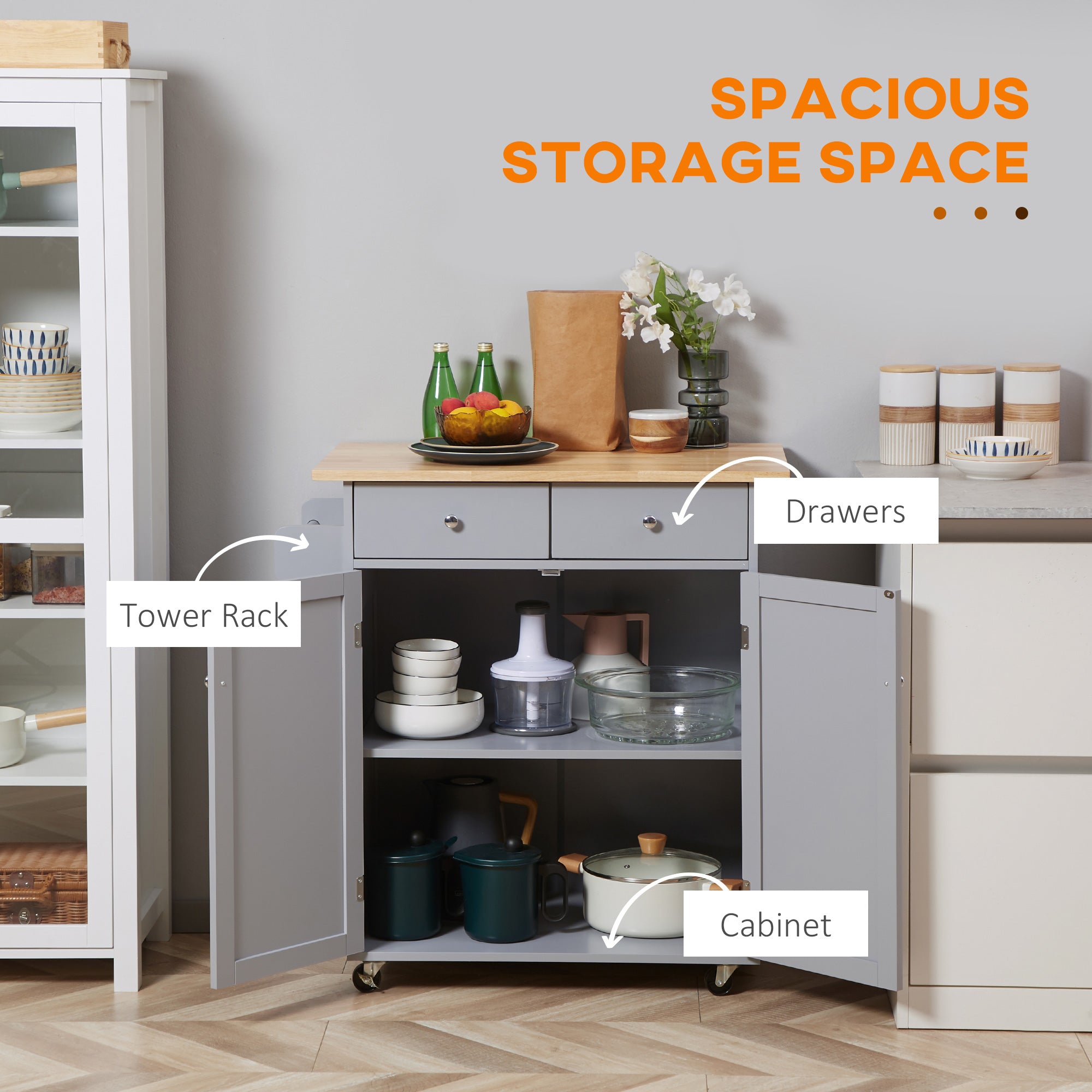 This prep & serving cart well fits limited spaces and can be moved to wherever you need it. 2 fauxll-out drawers, a double-door cabinet and a towel rack provide lots of space for supplies and accessories. Easy-roll wheels allow you to move wherever it is needed most. Solid rubberwood tabletop and MDF panels ensure sturdy construction and easy cleaning.