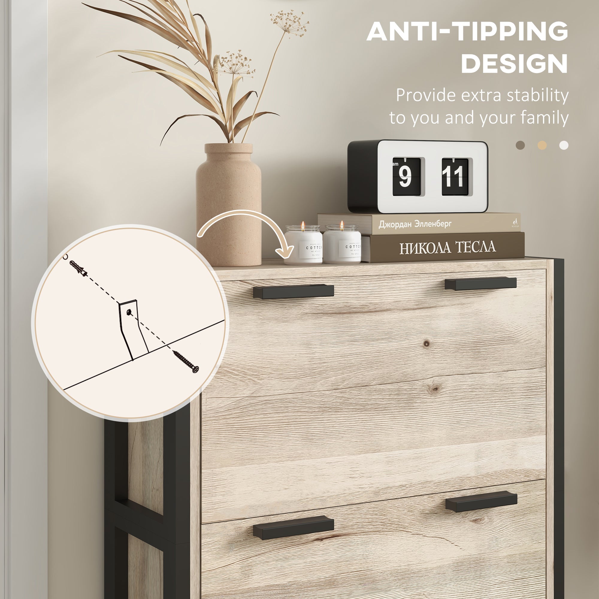 A natural aesthetic for handy home storage: this shoe cupboard is here to hold your footwear in simple - and customisable - style. Body is made from a particle board and MDF frame, in a wood-effect finish - looks natural when left untouched of can be painted how you want. Features three tiling drawers to hold up to 18 pairs of shoes: great for shared households or those with a big shoe collection. Complete with anti-tipping straps for safety.