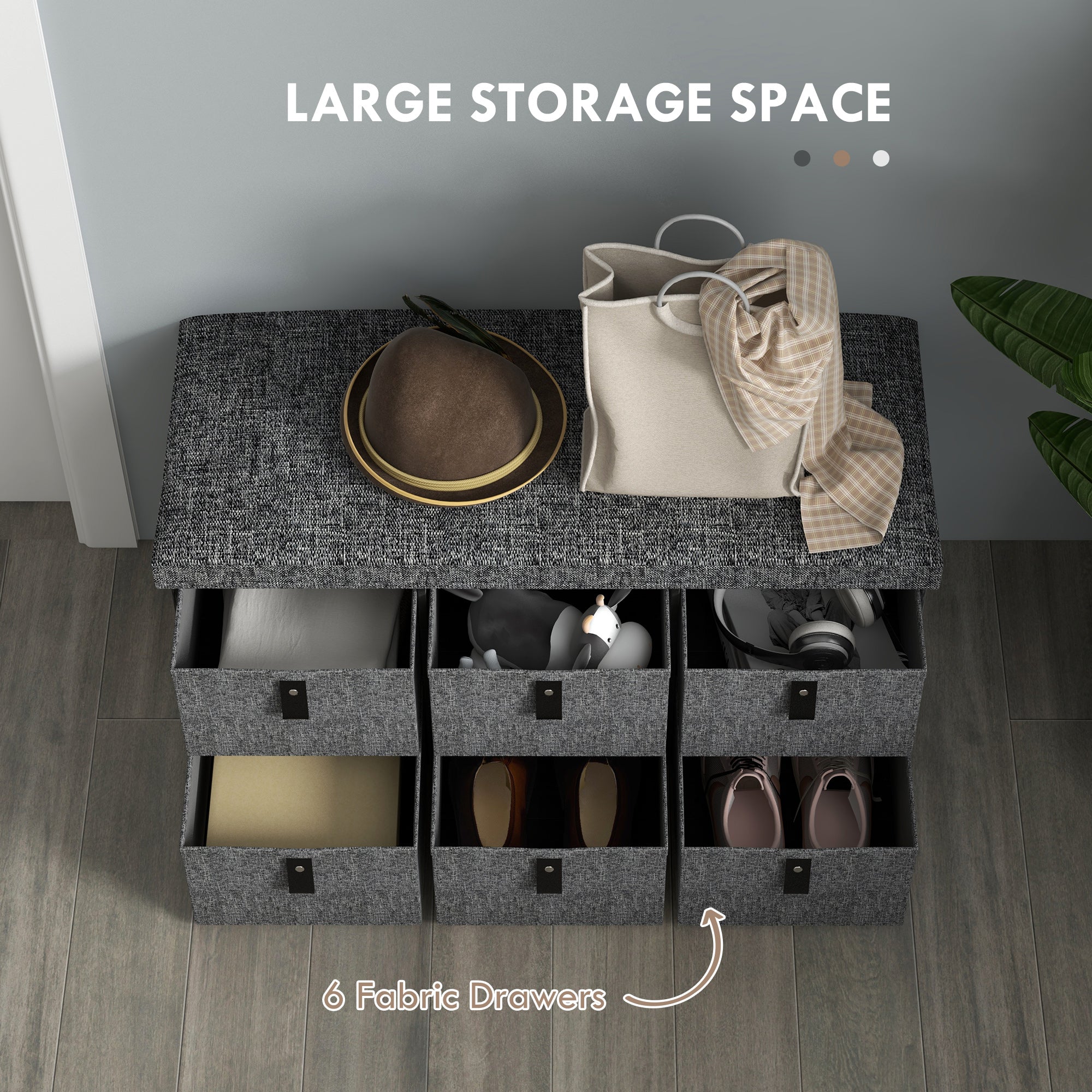 The simple and easy way to keep all footwear together, with this shoe bench. The frame is made from MDF for a strong, supportive core. The shoe storage unit features six drawers: in total it holds six shoe pairs (one pair per drawer). The top is padded to allow you to sit down comfortably when taking shoes off and fauxtting them on. A minimalistic must-have piece, suitable for plenty of home and office spaces.