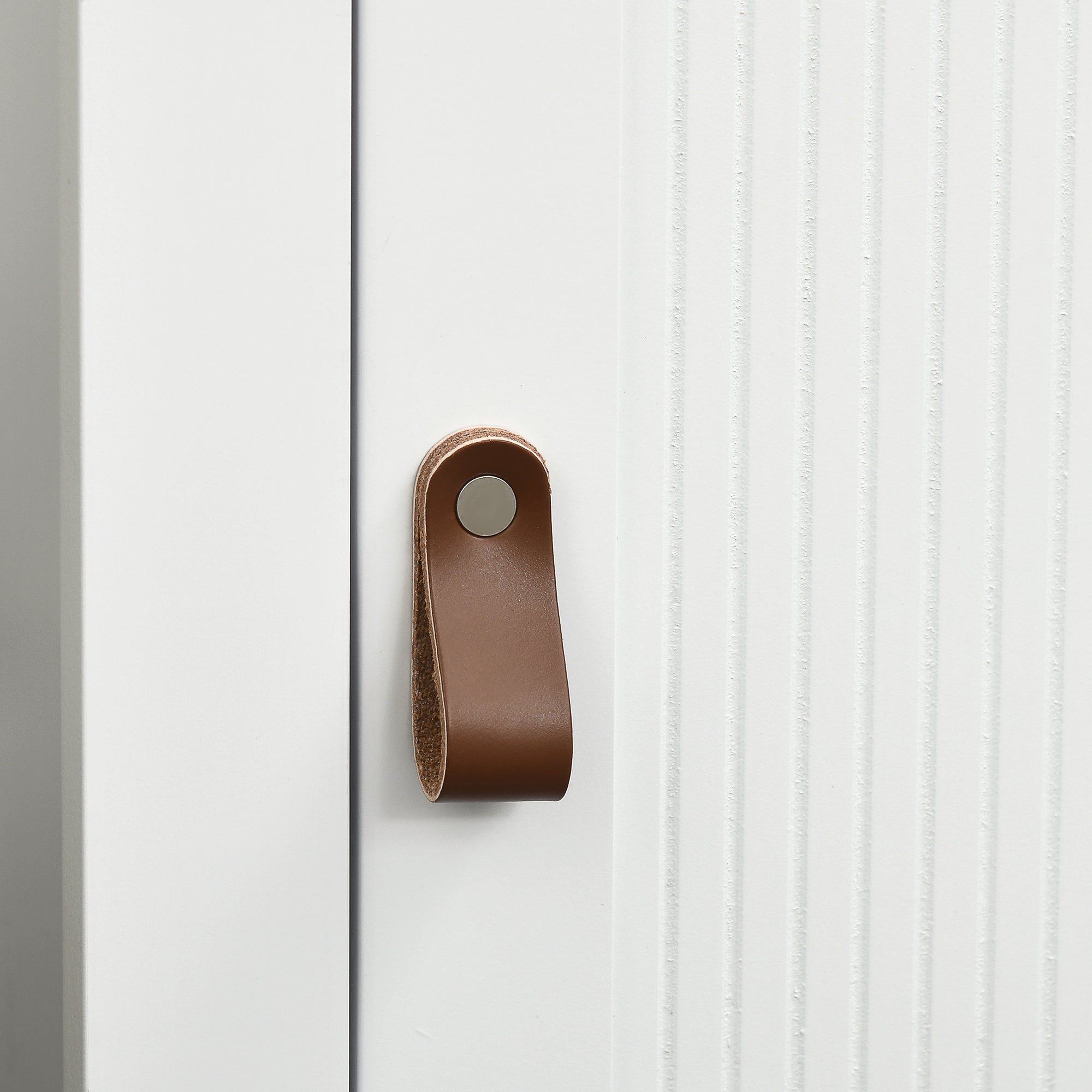 This bathroom floor cabinet unit provides extra space, wherever needed. It features a shelf, a two-tier cupboard and a flat top - plenty of room for towels, hygiene products and cleaning supplies, complete with a faux leather handle to open the door easily.