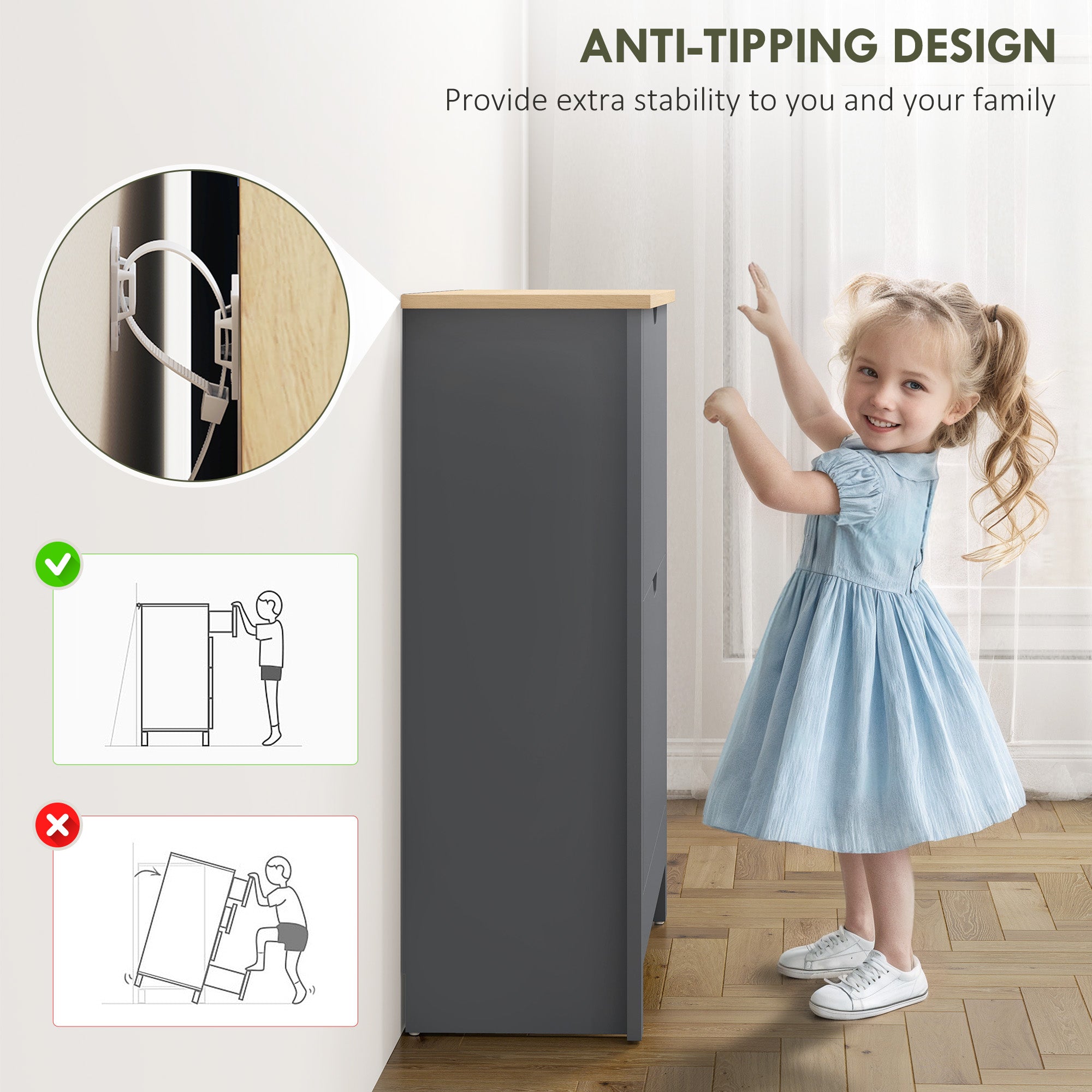 - Anti-tipping straps included to attach to wall safely