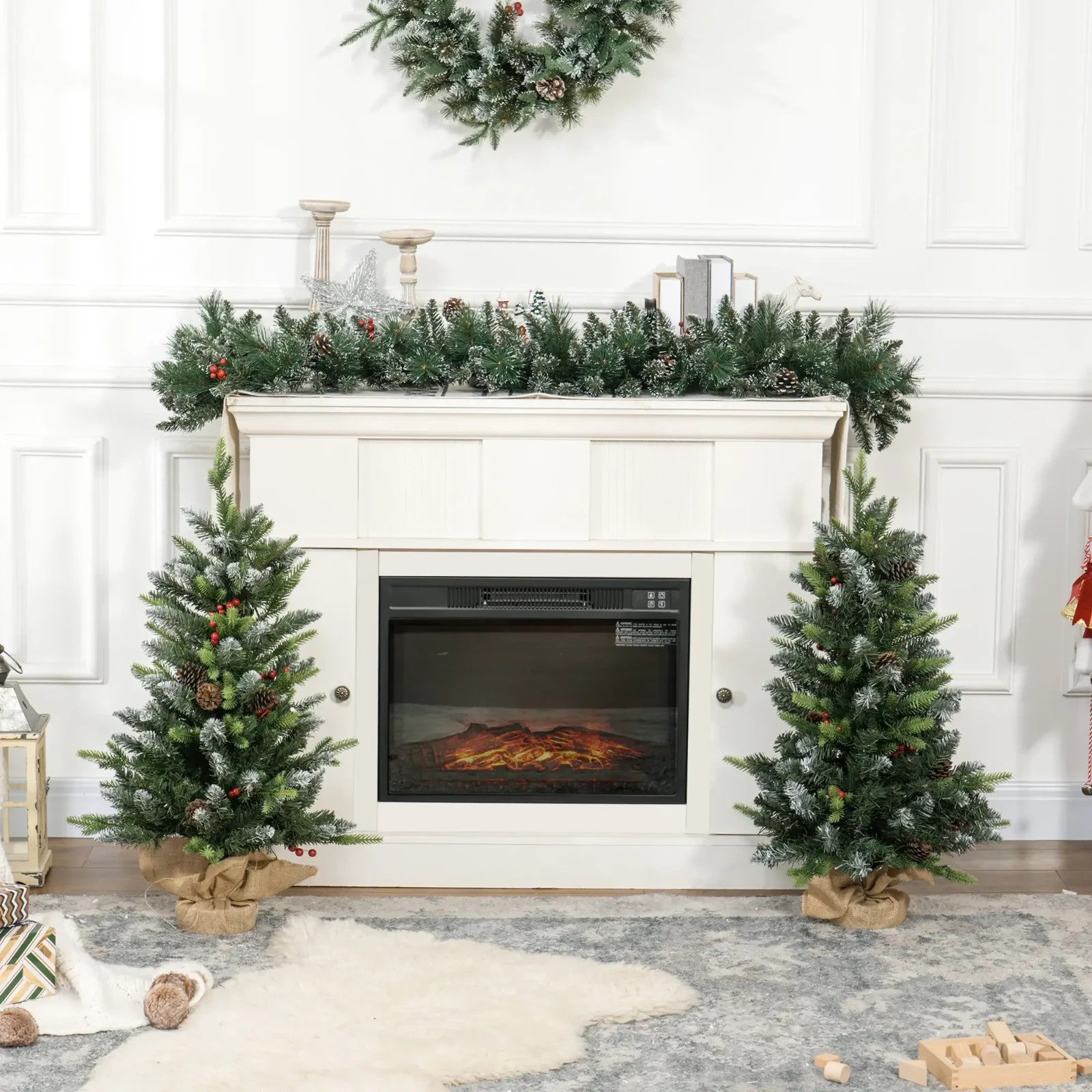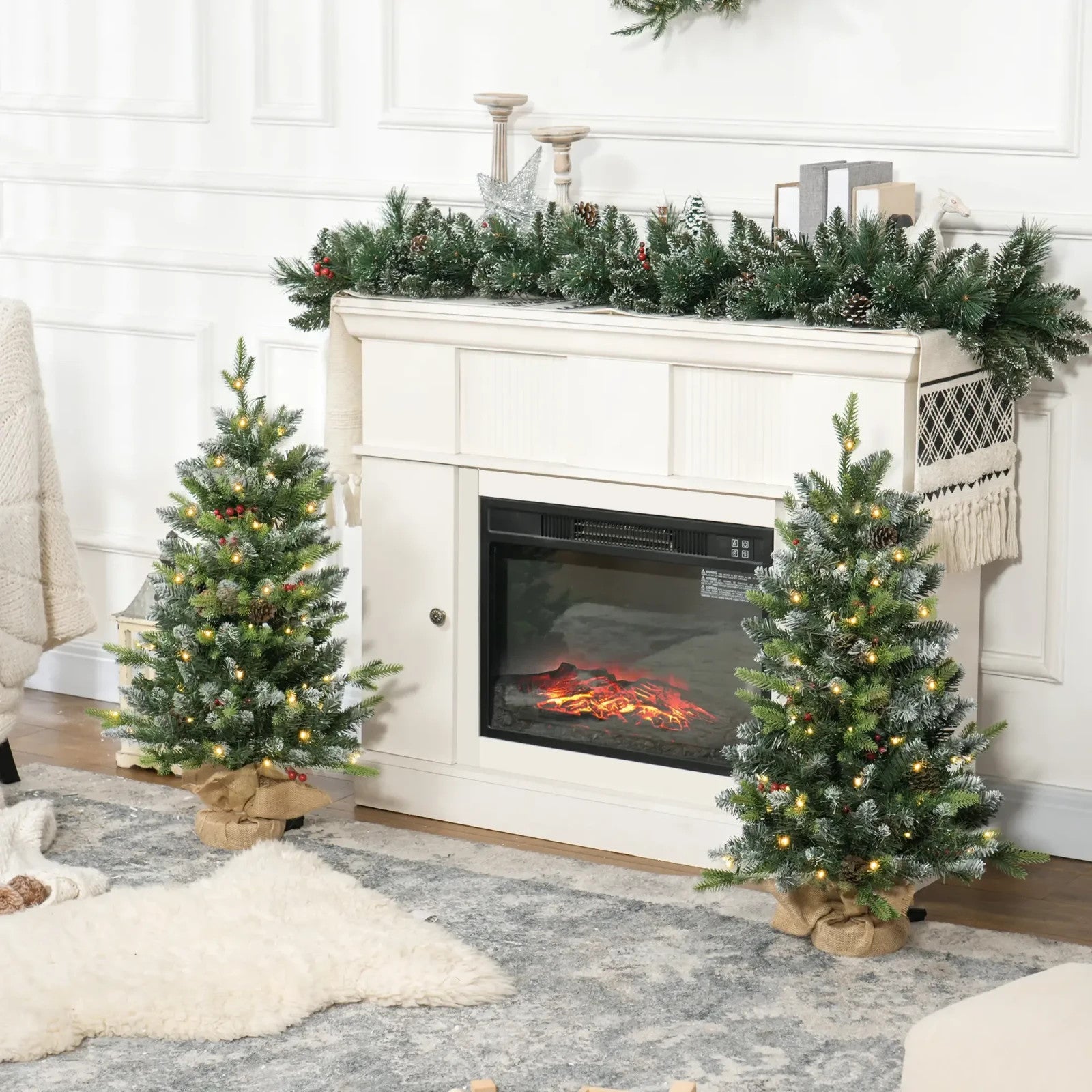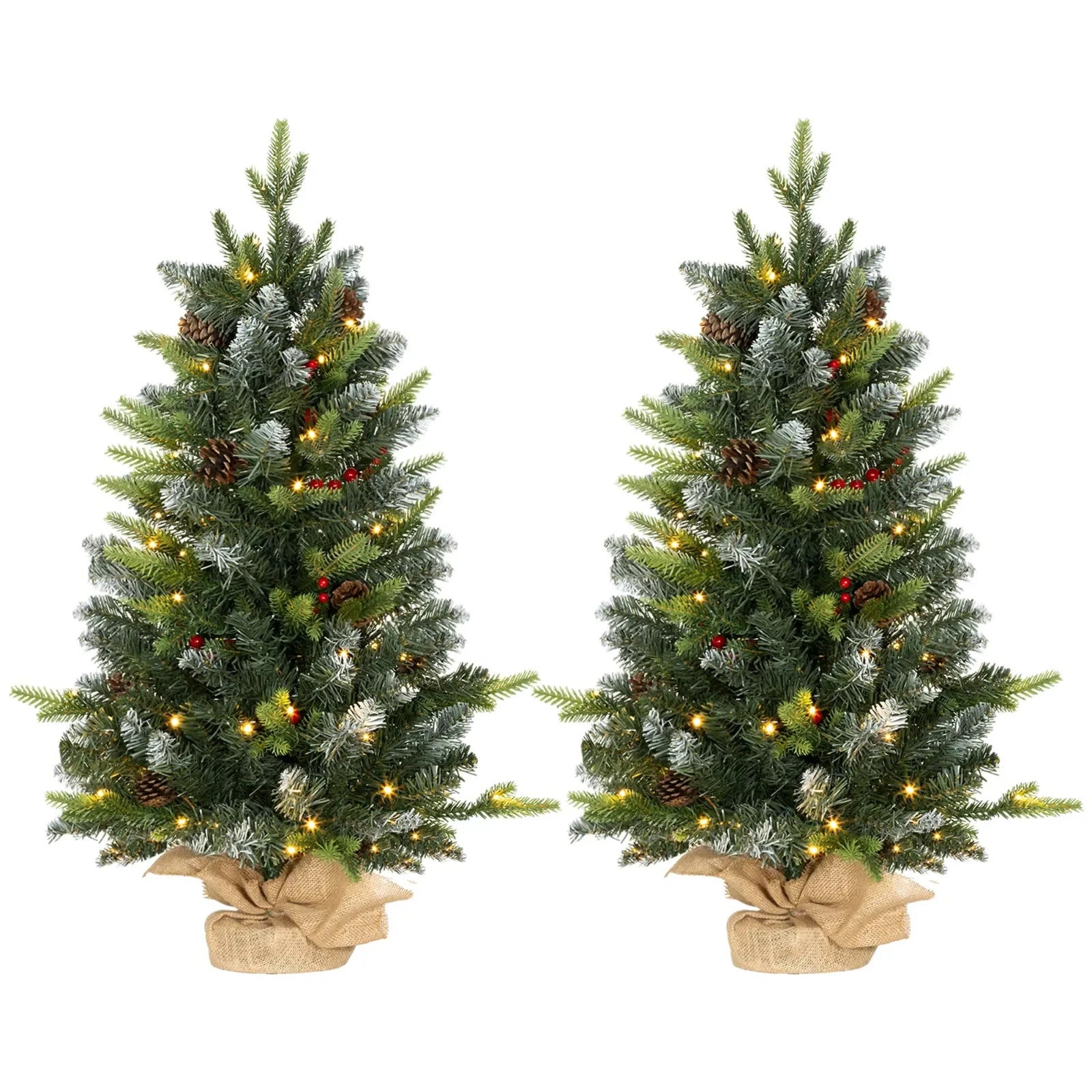 Christmas spirit, doubled with this set of two 3ft prelit christmas trees. With snow-brushed tips, red berries and pine cones, the trees are already dressed and can be set up how they arrive; add your own decorations for a personal touch. Each Christmas tree with lights gently illuminates your space, looking beautiful in the dark. Set up is easy too, taking about ten minutes, you just need to shape the branches into place.