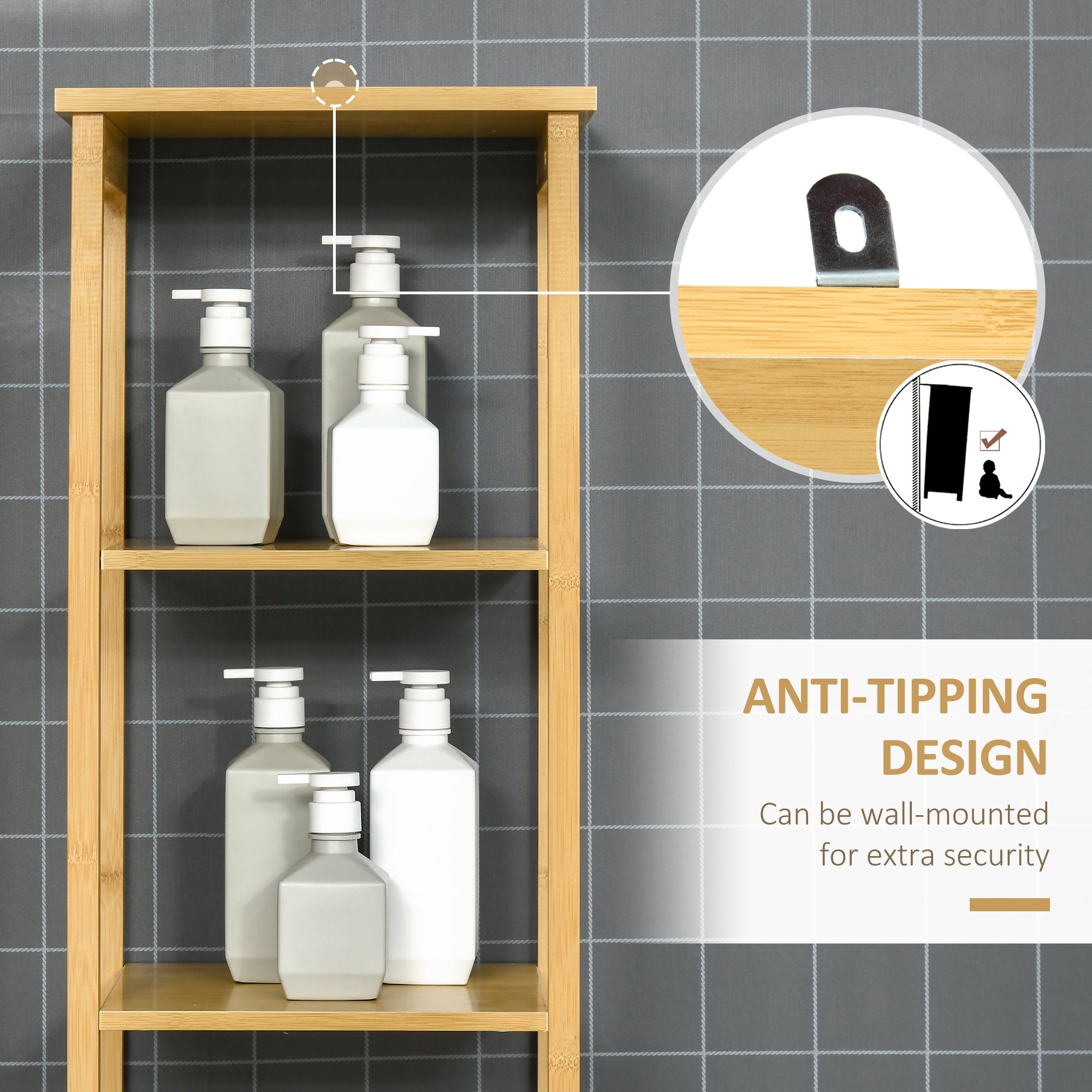 This tallboy bathroom cabinet is a must-have for every home. It combines three upper shelves with a bottom cupboard, giving you plenty of storage for the surrounding space. The tall storage cabinet is made from bamboo frame, so it's a strong and sturdy piece, as well as being naturally resistant to rotting and bacterial build-up. It's fitted with a slatted door to promote better airflow. Its tall and narrow design makes it great for smaller spots.